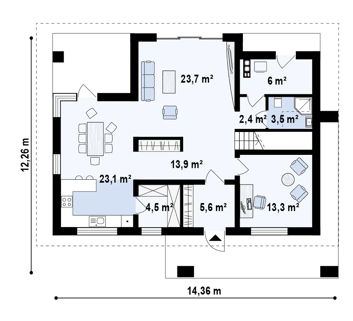 Sień – 5,6 m² Spiżarnia – 4,5 m² Kuchnia + jadalnia – 23,1 m² Salon – 23,7 m² Pomieszczenie gospodarcze – 6,0 m² / 5,9 m² Hol – 2,4 m² Łazienka – 3,5 m² Gabinet – 13,3 m² Hol + schody – 13,9 m²