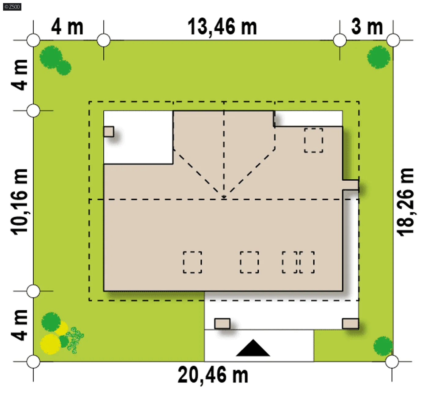 Minimalne wymiary działki szerokość 20,46 m długość 18,26 m Wymiary elewacji frontowej 14,36 m