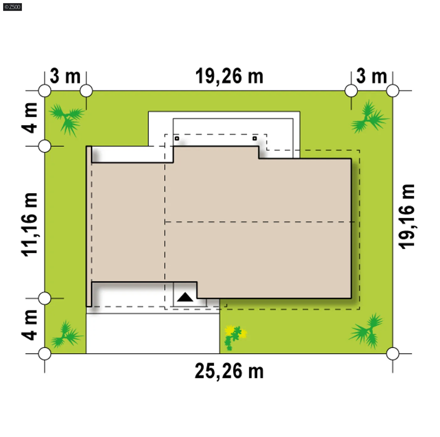 Minimalne wymiary działki szerokość 25,26 m długość 19,16 m Wymiary elewacji frontowej 19,26 m