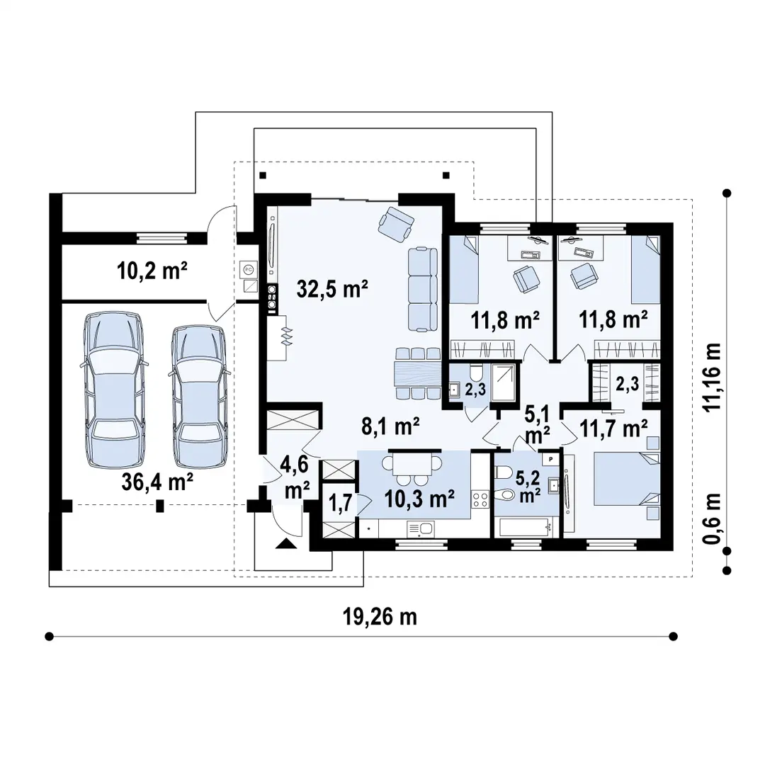 Sień – 4,6 m² Hol – 8,1 m² Kuchnia – 10,3 m² Spiżarnia – 1,7 m² Salon + jadalnia – 32,5 m² WC – 2,3 m² Hol – 5,1 m² Łazienka – 5,2 m² Pokój – 11,7 m² Garderoba – 2,3 m² Pokój – 11,8 m² Pokój – 11,8 m² Garaż – 0,0 m² / 36,4 m² Pomieszczenie gospodarcze – 0,0 m² / 10,2 m²