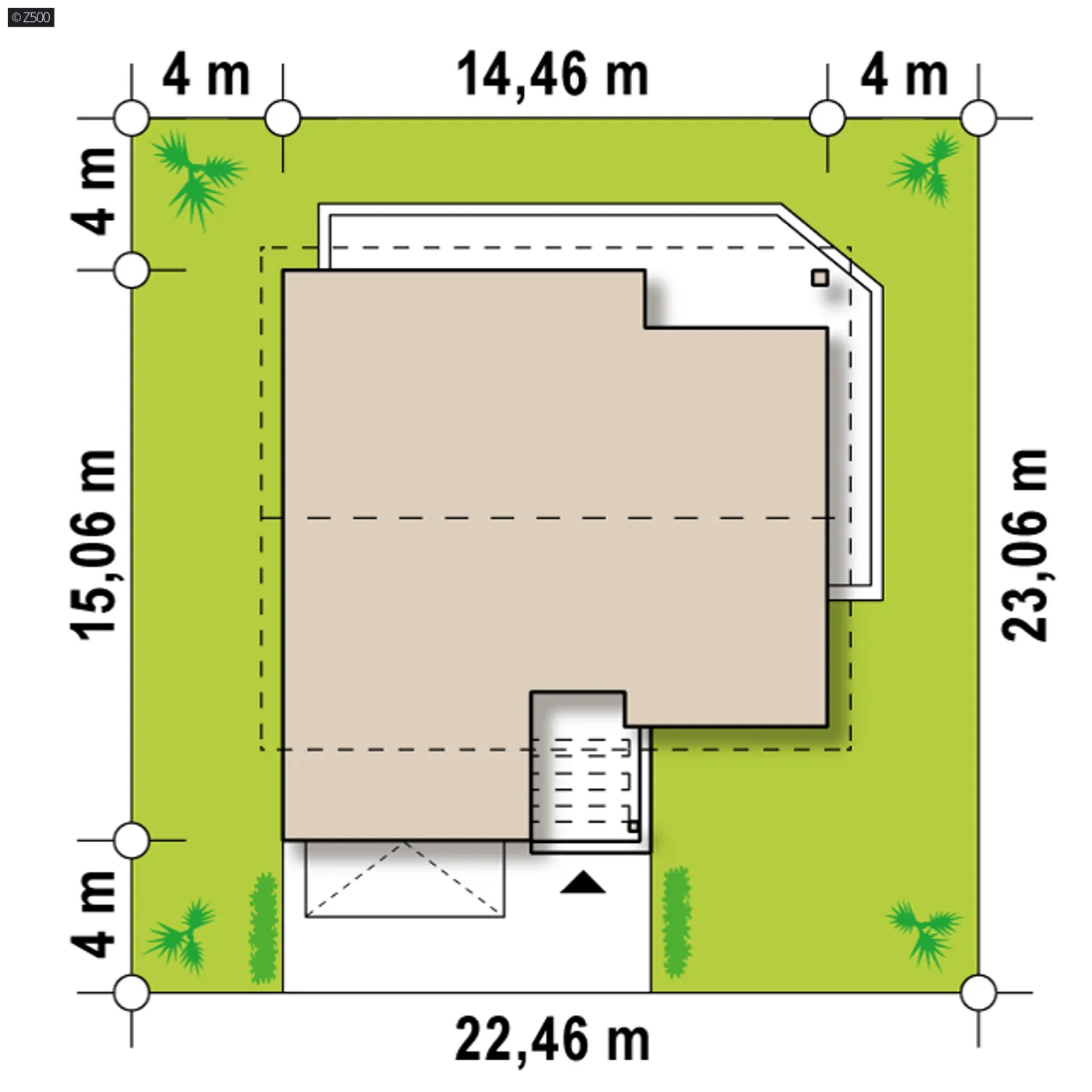 Minimalne wymiary działki szerokość 22,46 m długość 23,06 m Wymiary elewacji frontowej 14,46 m