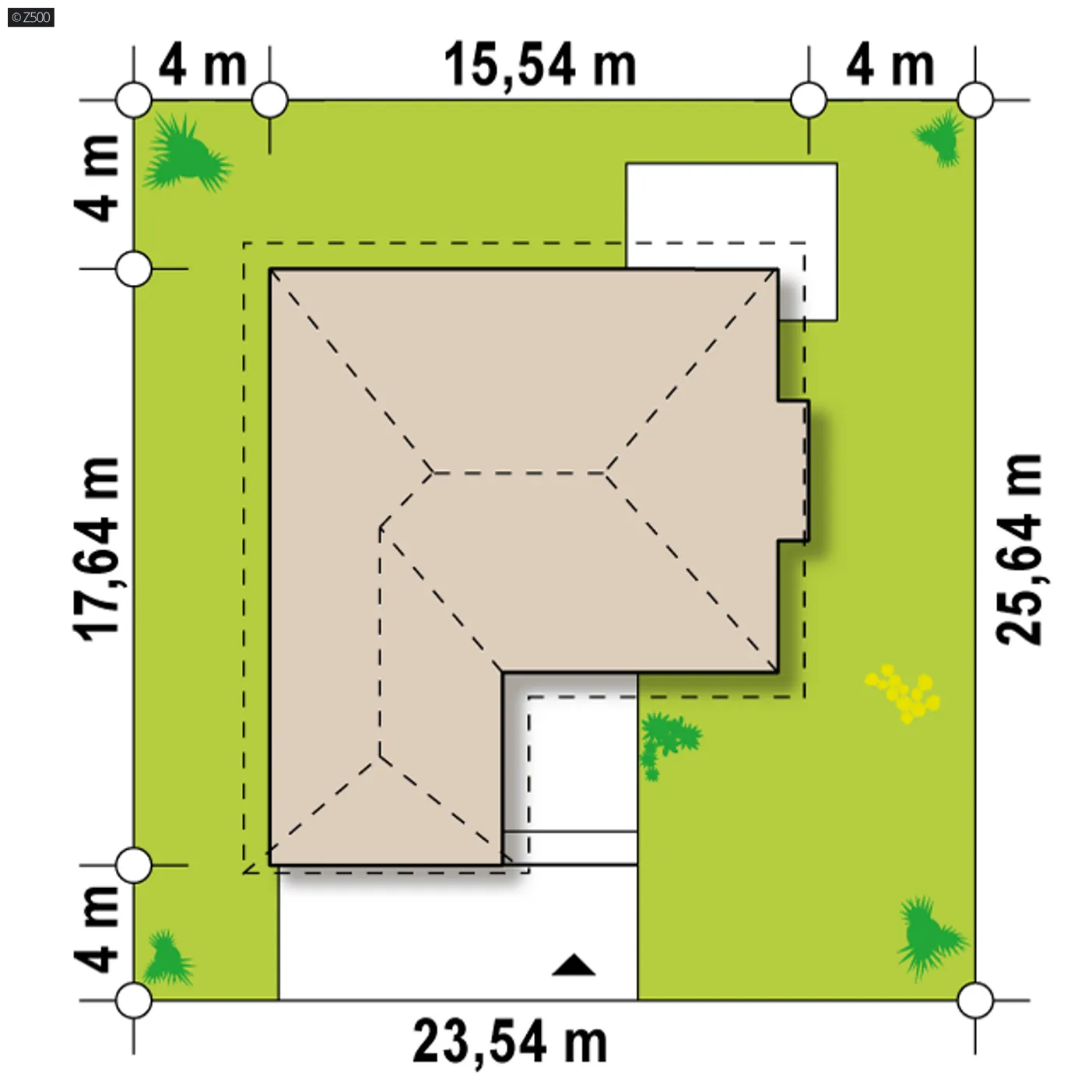 Minimalne wymiary działki szerokość 23,54 m długość 25,64 m Wymiary elewacji frontowej 15,54 m