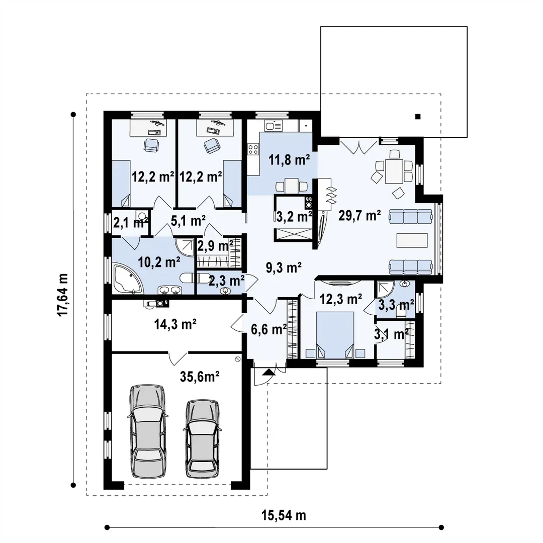 Salon – 29,7 m² Kuchnia – 11,8 m² Pralnia – 2,1 m² Hol – 9,3 m² Hol – 5,1 m² WC – 2,3 m² WC – 3,3 m² Pokój – 12,1 m² Pokój – 12,1 m² Pokój – 12,3 m² Łazienka – 10,2 m² Sień – 6,6 m² Spiżarnia – 3,1 m² Garderoba – 2,9 m² Garderoba – 3,1 m² Garaż – 35,6 m² Pomieszczenie gospodarcze – 14,8 m²