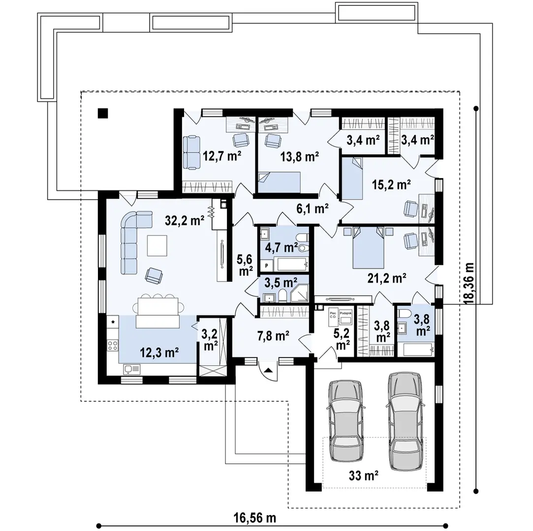 Gabinet – 12,7 m² Garaż – 0,0 m² / 33,0 m² Garderoba – 3,4 m² Garderoba – 3,4 m² Garderoba – 3,8 m² Hol – 5,6 m² Hol – 6,1 m² Kuchnia – 12,3 m² Łazienka – 3,5 m² Łazienka – 3,8 m² Łazienka – 4,7 m² Pomieszczenie gospodarcze – 0,0 m² / 5,2 m² Pokój – 13,8 m² Pokój – 15,2 m² Pokój – 21,2 m² Salon + jadalnia – 32,2 m² Sień – 7,8 m² Spiżarnia – 3,2 m²