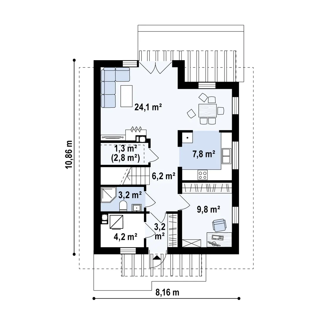Sień – 3,2 m² Pomieszczenie gospodarcze – 4,2 m² WC – 3,2 m² Hol – 6,2 m² Spiżarnia – 1,3 m² / 2,8 m² Salon – 24,1 m² Kuchnia – 7,8 m² Gabinet – 9,8 m²