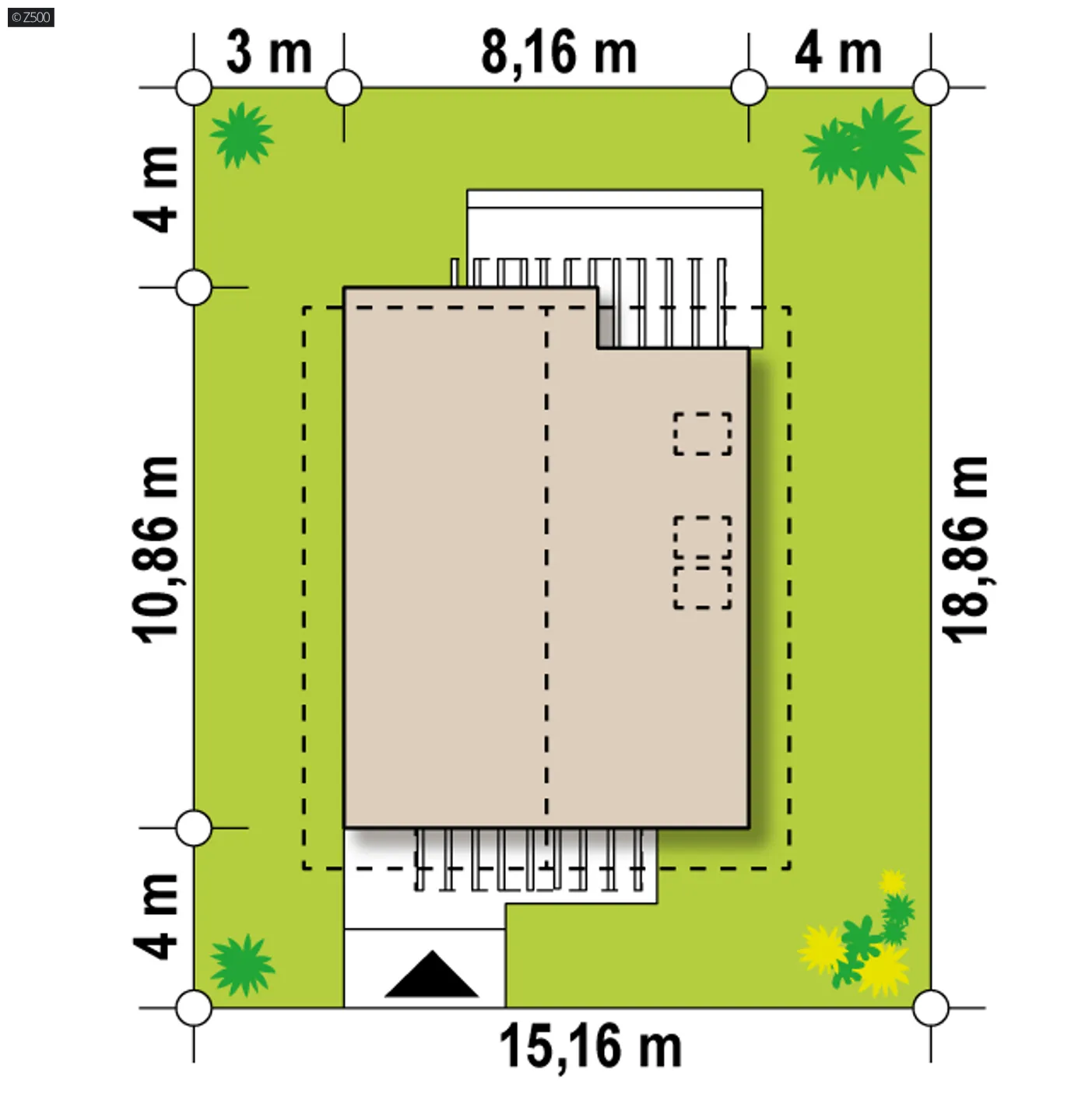 Minimalne wymiary działki szerokość 15,16 m długość 18,86 m Wymiary elewacji frontowej 8,16 m