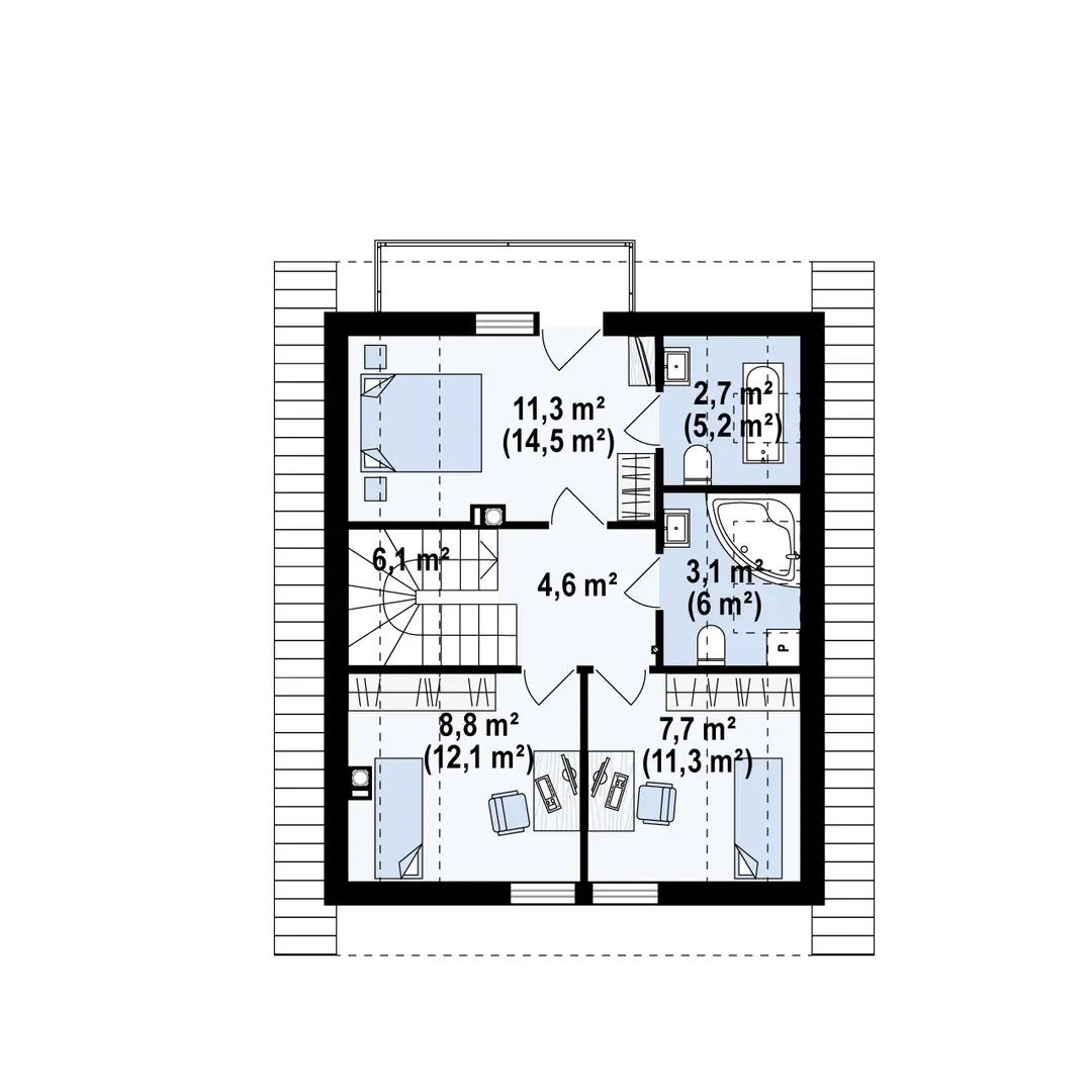 Hol – 4,6 m² Pokój – 11,3 m² / 14,5 m² Łazienka – 2,7 m² / 5,2 m² Łazienka – 3,1 m² / 6,0 m² Pokój – 7,7 m² / 11,3 m² Pokój – 8,8 m² / 12,1 m² Schody – 0,0 m² / 6,1 m²