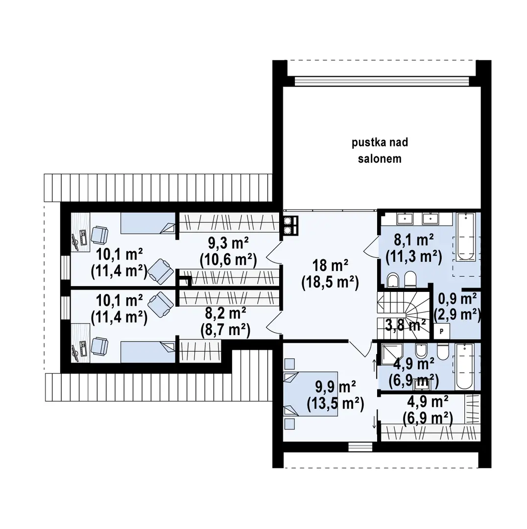 Hol – 18,0 m² / 18,5 m² Pokój – 9,9 m² / 13,5 m² Garderoba – 4,9 m² / 6,9 m² Łazienka – 4,9 m² / 6,9 m² Łazienka – 8,1 m² / 11,3 m² Pralnia – 0,9 m² / 2,9 m² Garderoba – 9,3 m² / 10,6 m² Pokój – 10,1 m² / 11,4 m² Garderoba – 8,2 m² / 8,7 m² Pokój – 10,1 m² / 11,4 m² Schody – 0,0 m² / 3,8 m²