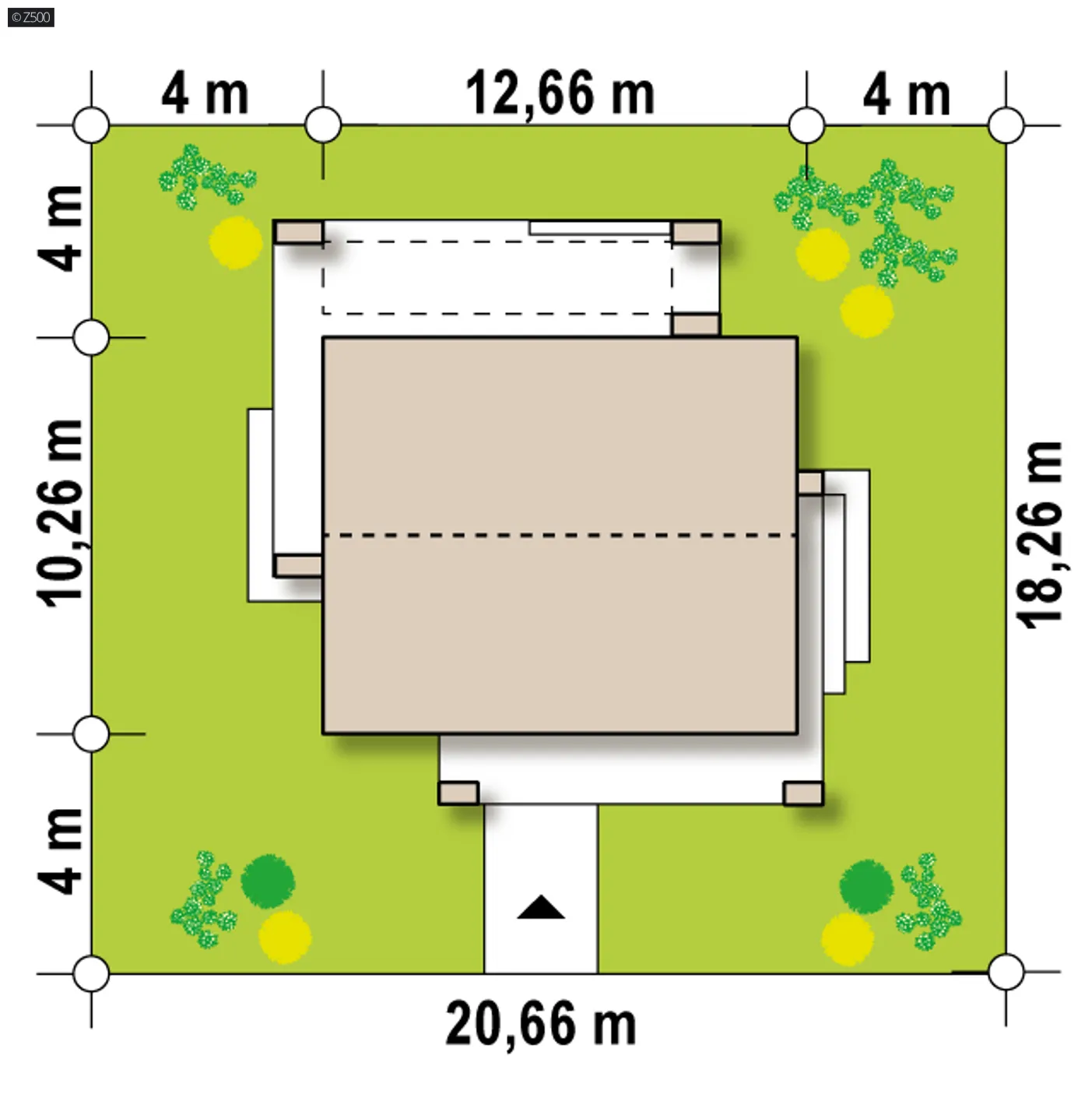 Minimalne wymiary działki szerokość 20,66 m długość 18,26 m Wymiary elewacji frontowej 14,2 m
