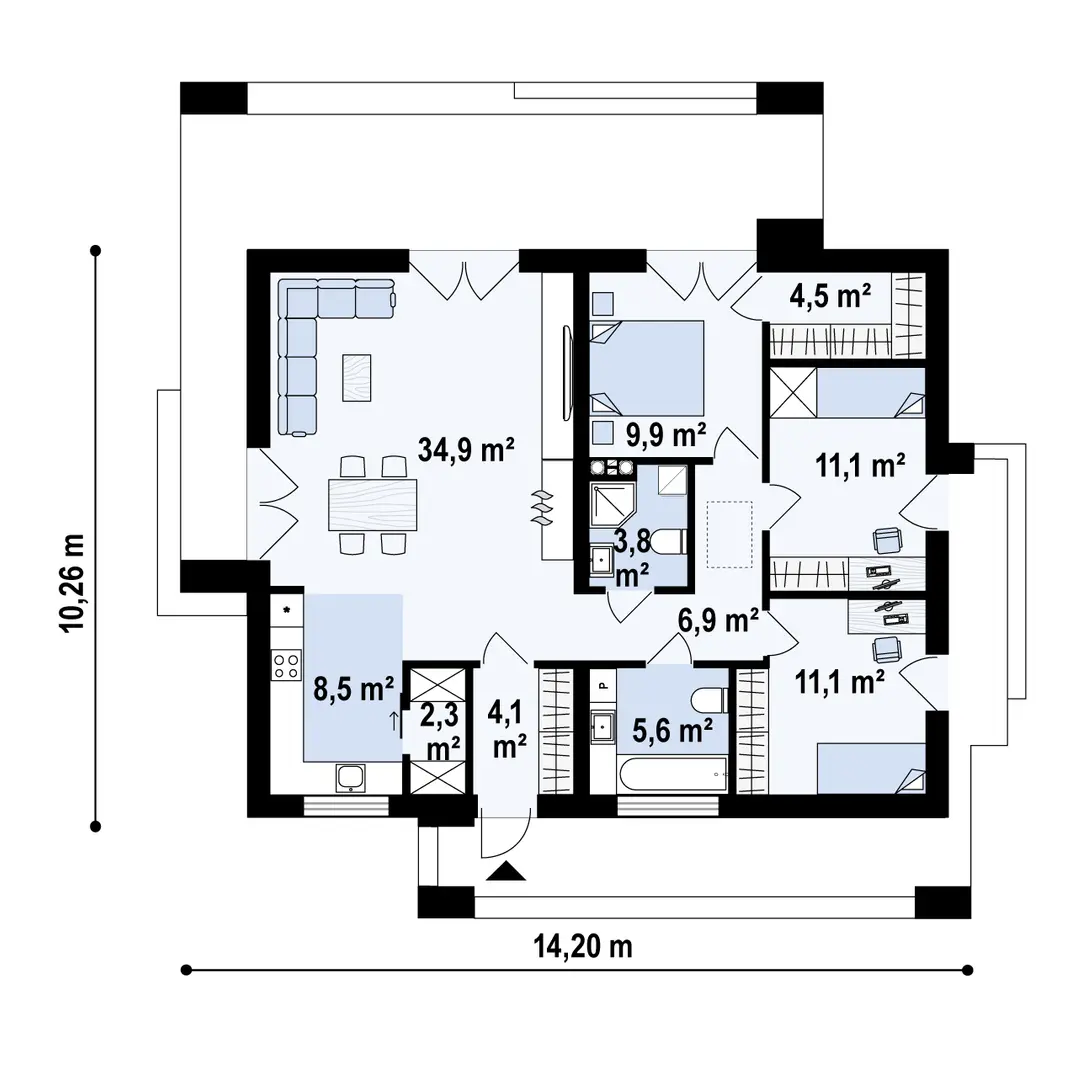 Sień – 4,1 m² Spiżarnia – 2,3 m² Kuchnia – 8,5 m² Salon + jadalnia – 34,9 m² Hol – 6,9 m² Łazienka – 3,8 m² Łazienka – 5,6 m² Pokój – 11,2 m² Pokój – 11,1 m² Pokój – 9,9 m² Garderoba – 4,5 m²