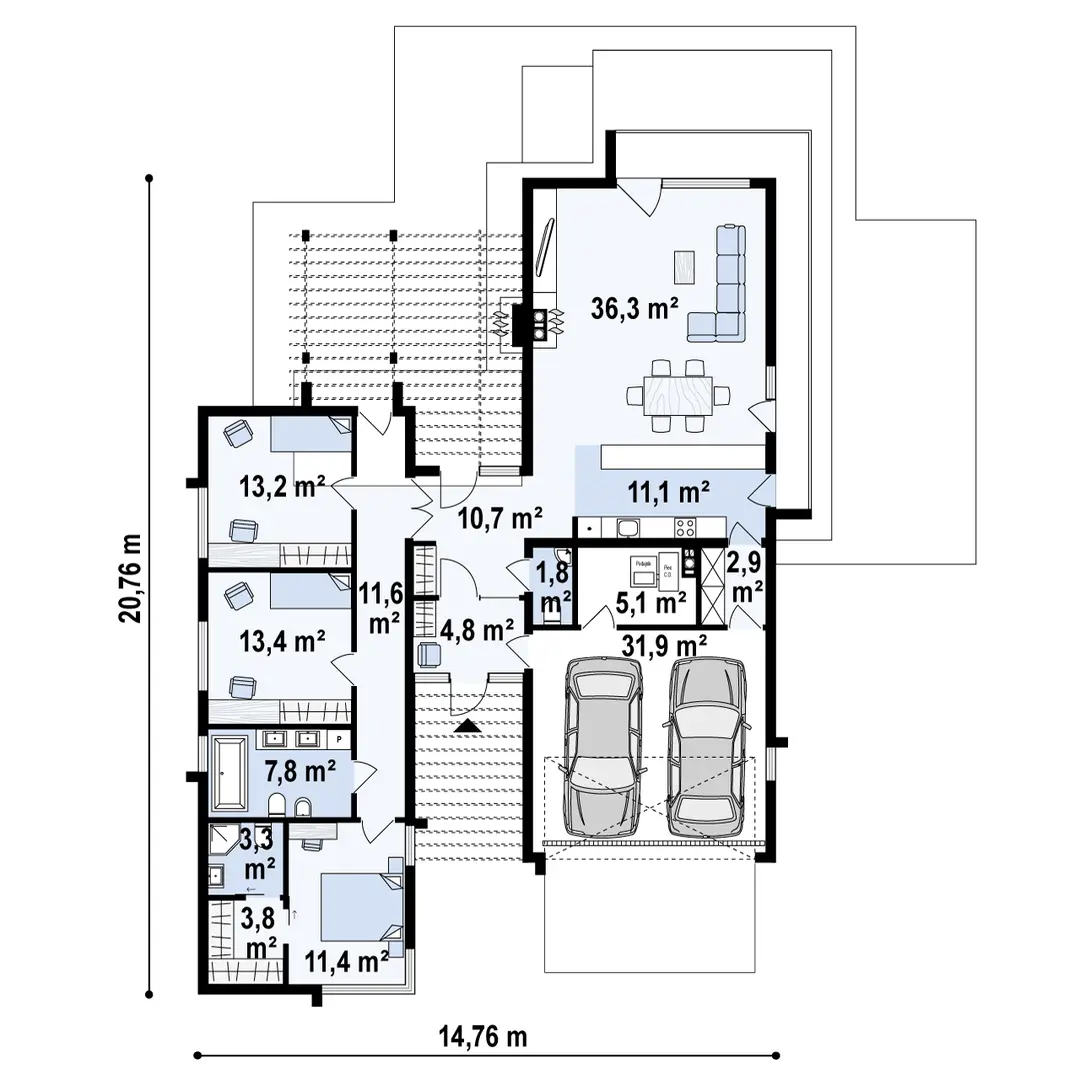 Sień – 4,8 m² WC – 1,8 m² Pomieszczenie gospodarcze – 0,0 m² / 5,1 m² Spiżarnia – 2,9 m² Kuchnia – 11,1 m² Salon + jadalnia – 36,3 m² Hol – 10,7 m² Hol – 11,6 m² Pokój – 13,2 m² Pokój – 13,4 m² Łazienka – 7,8 m² Pokój – 11,4 m² Łazienka – 3,3 m² Garderoba – 3,8 m² Garaż – 0,0 m² / 31,9 m²