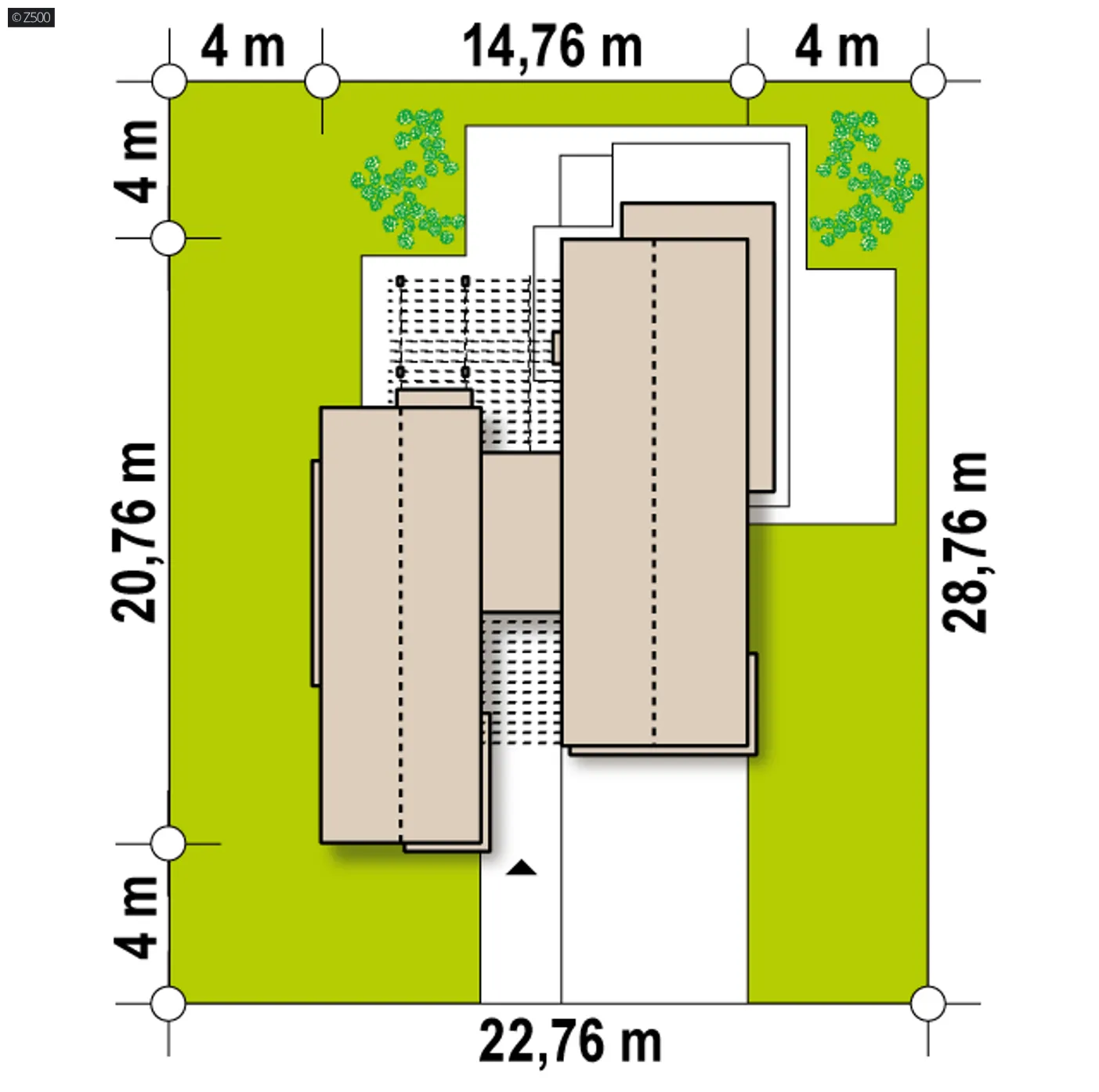 Minimalne wymiary działki szerokość 22,76 m długość 28,76 m Wymiary elewacji frontowej 14,75 m