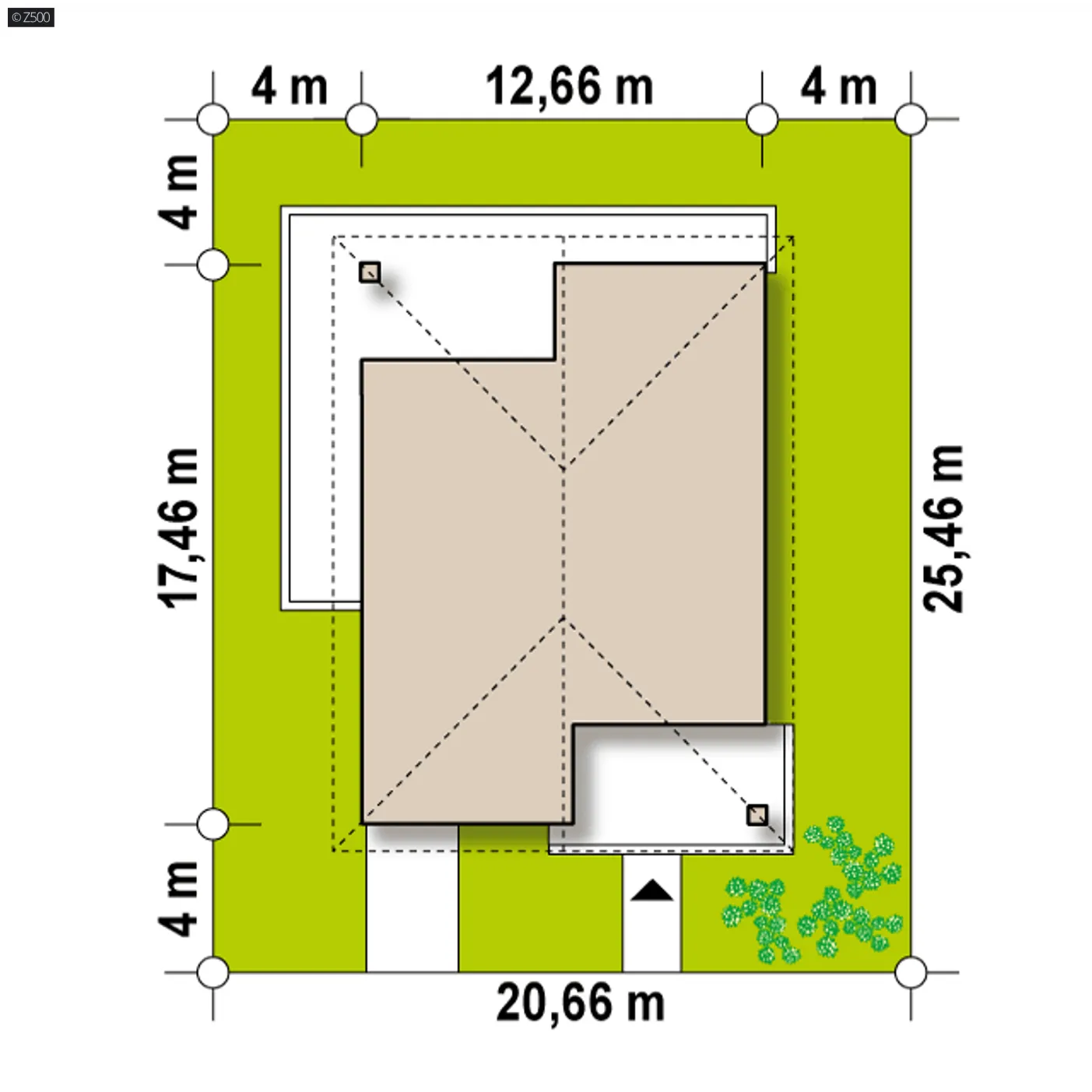 Minimalne wymiary działki szerokość 20,56 m długość 25,45 m Wymiary elewacji frontowej 12,66 m