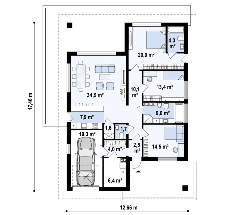 Sień – 2,5 m² Garderoba – 4,0 m² Hol – 10,1 m² Kuchnia – 7,9 m² WC – 1,7 m² Spiżarnia – 1,6 m² Salon + jadalnia – 34,5 m² Pokój – 14,5 m² Łazienka – 9,0 m² Pokój – 13,4 m² Pokój – 20,0 m² Łazienka – 4,3 m² Pomieszczenie gospodarcze – 0,0 m² / 6,4 m² Garaż – 0,0 m² / 19,3 m²