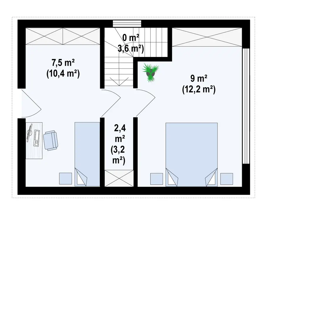 Hol – 2,4 m² / 3,2 m² Pokój – 9,0 m² / 12,2 m² Schody – 0,0 m² / 3,6 m² Pokój – 7,5 m² / 10,4 m²