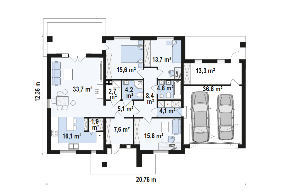 Sień – 7,6 m² Hol – 5,1 m² Kuchnia – 16,1 m² Spiżarnia – 1,9 m² Salon + jadalnia – 33,7 m² Pomieszczenie gospodarcze – 2,7 m² Łazienka – 4,2 m² Hol – 8,4 m² Gabinet – 15,8 m² Pralnia – 4,1 m² Łazienka – 4,8 m² Pokój – 15,6 m² Pokój – 13,7 m² Garaż – 36,8 m² Garaż + pom. gosp. – 13,3 m²