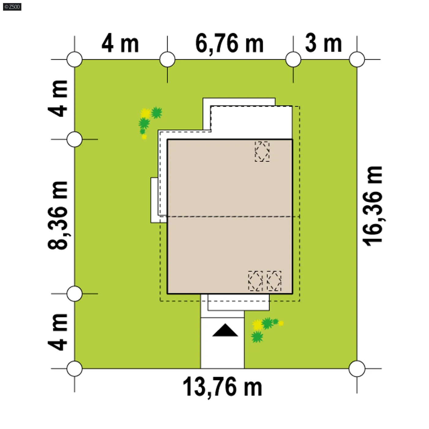 Minimalne wymiary działki szerokość 13,76 m długość 16,36 m Wymiary elewacji frontowej 6,76 m