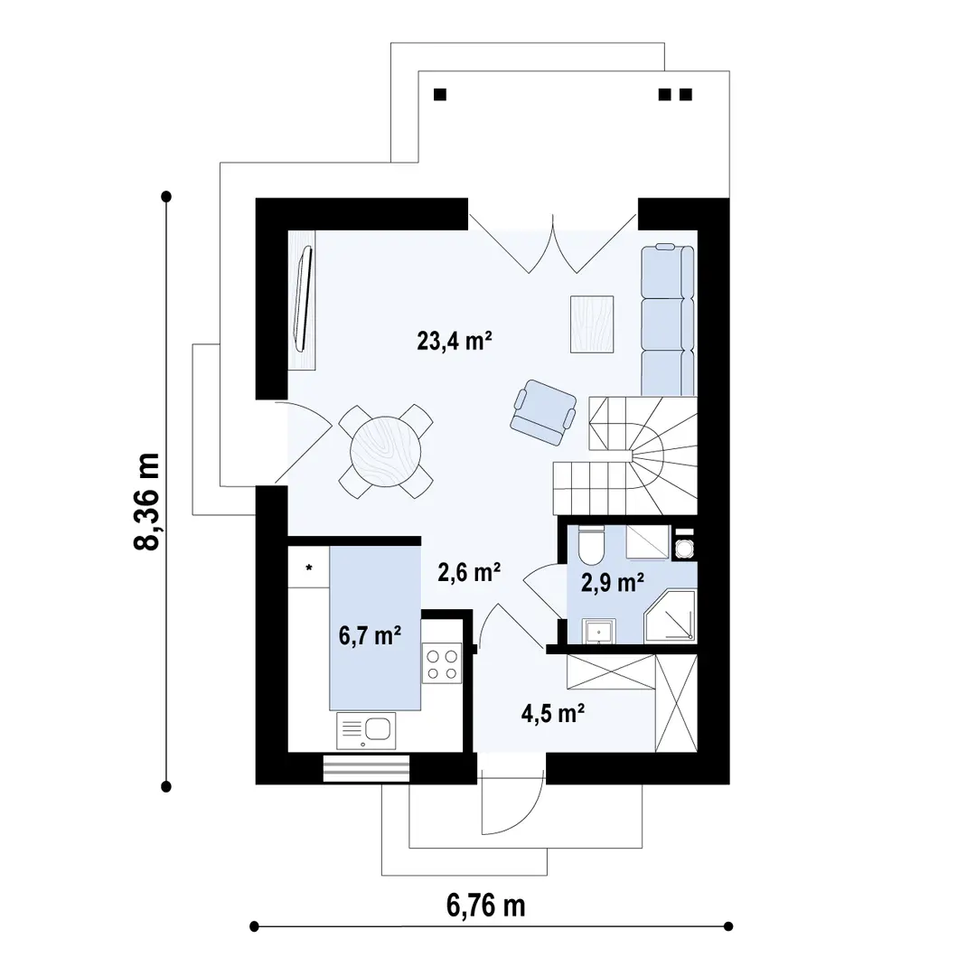 Sień – 4,5 m² Hol – 2,6 m² Kuchnia – 6,7 m² Salon + jadalnia – 22,8 m² / 23,4 m² Łazienka – 2,9 m²