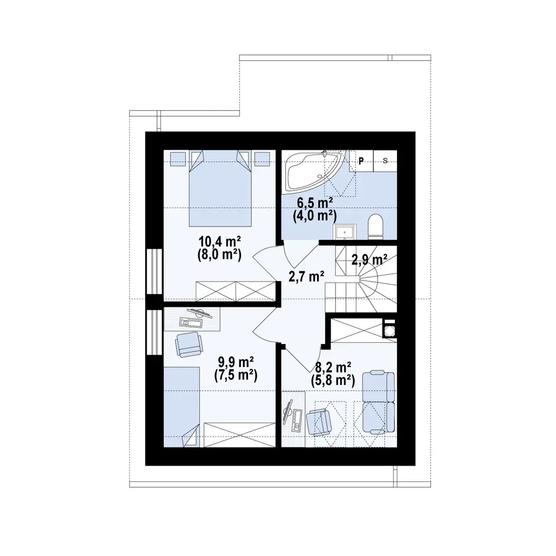 Hol – 2,7 m² Pokój – 5,8 m² / 8,2 m² Pokój – 7,5 m² / 9,9 m² Pokój – 8,0 m² / 10,4 m² Łazienka – 4,0 m² / 6,5 m² Schody – 0,0 m² / 2,9 m²