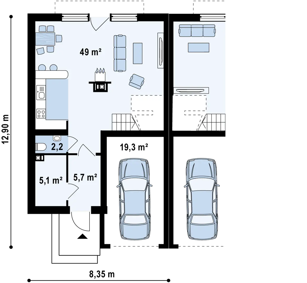 Sień – 5,7 m² Pomieszczenie gospodarcze – 5,1 m² WC – 2,2 m² Salon + kuchnia – 49,0 m² Garaż – 19,3 m²