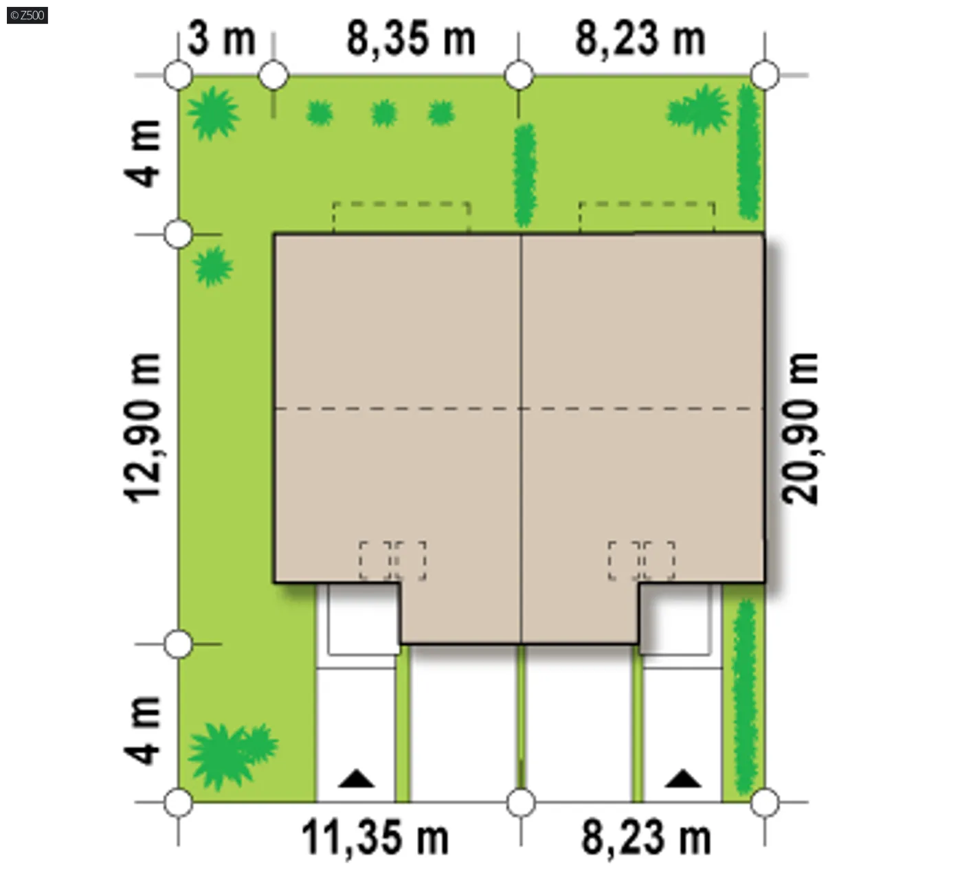Minimalne wymiary działki szerokość 14,35 m długość 20,9 m Wymiary elewacji frontowej 8,35 m