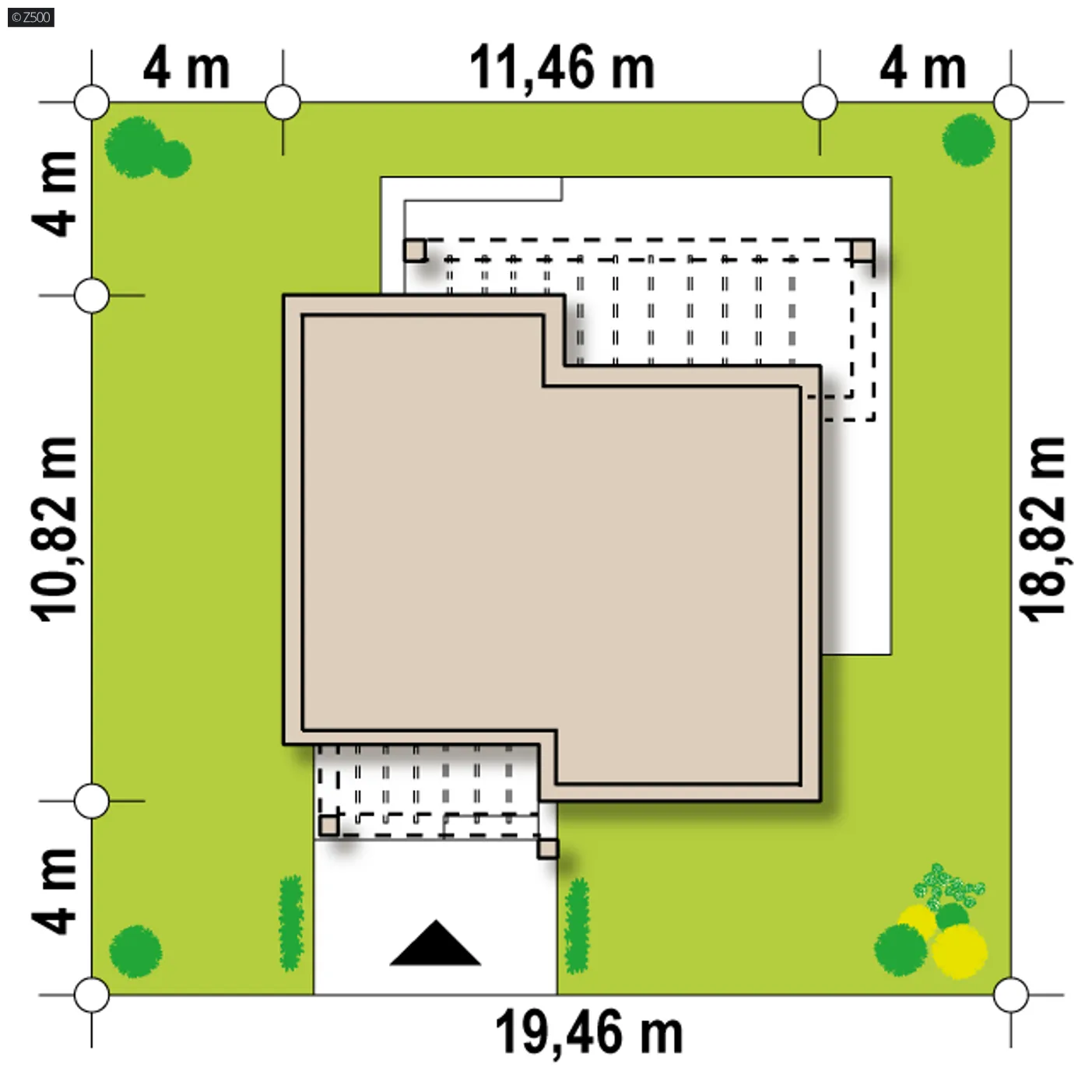 Minimalne wymiary działki szerokość 19,46 m długość 18,82 m Wymiary elewacji frontowej 11,46 m