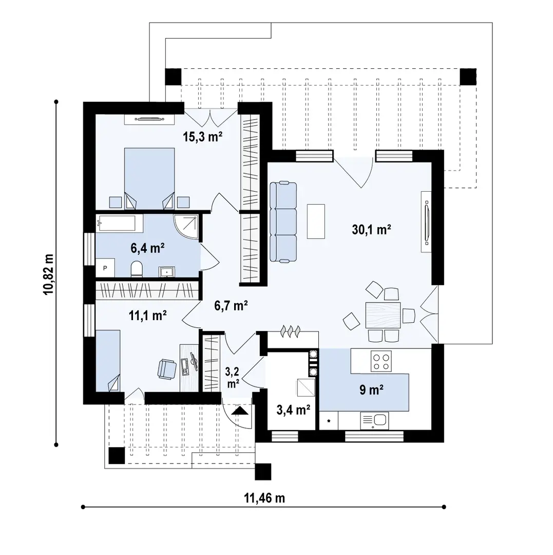 Sień – 3,2 m² Hol – 6,7 m² Kuchnia – 9,0 m² Salon + jadalnia – 30,1 m² Pokój – 11,1 m² Łazienka – 6,4 m² Pokój – 15,3 m² Pomieszczenie gospodarcze – 0,0 m² / 3,4 m²