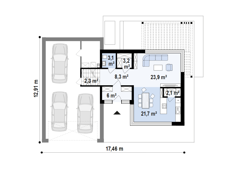 Sień – 6,0 m² Hol – 8,3 m² Salon – 23,9 m² Kuchnia + jadalnia – 21,7 m² Spiżarnia – 2,1 m² WC – 3,1 m² Garderoba – 3,2 m² Schody – 0,0 m² / 2,3 m²