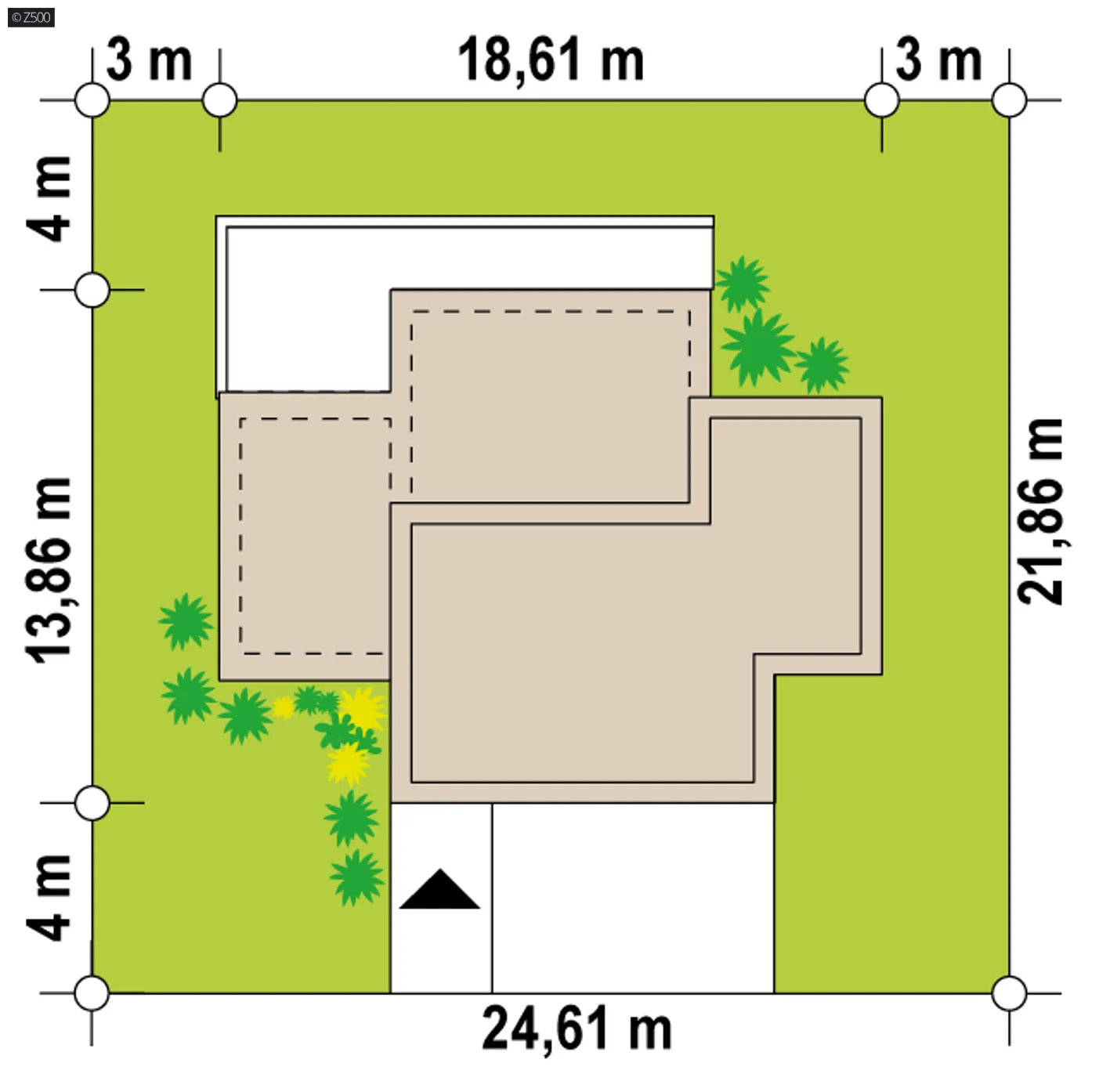 Minimalne wymiary działki szerokość 24,61 m długość 21,86 m Wymiary elewacji frontowej 18,68 m