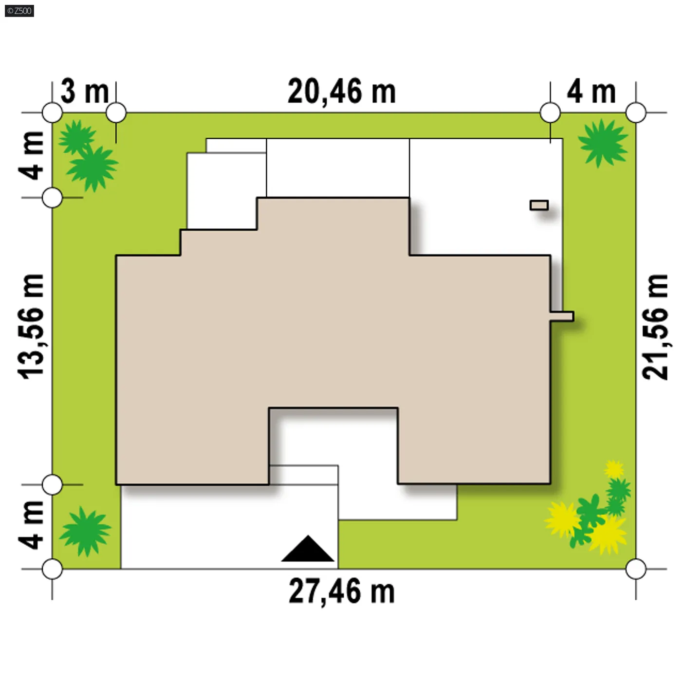 Minimalne wymiary działki szerokość 27,36 m długość 21,46 m Wymiary elewacji frontowej 21,44 m
