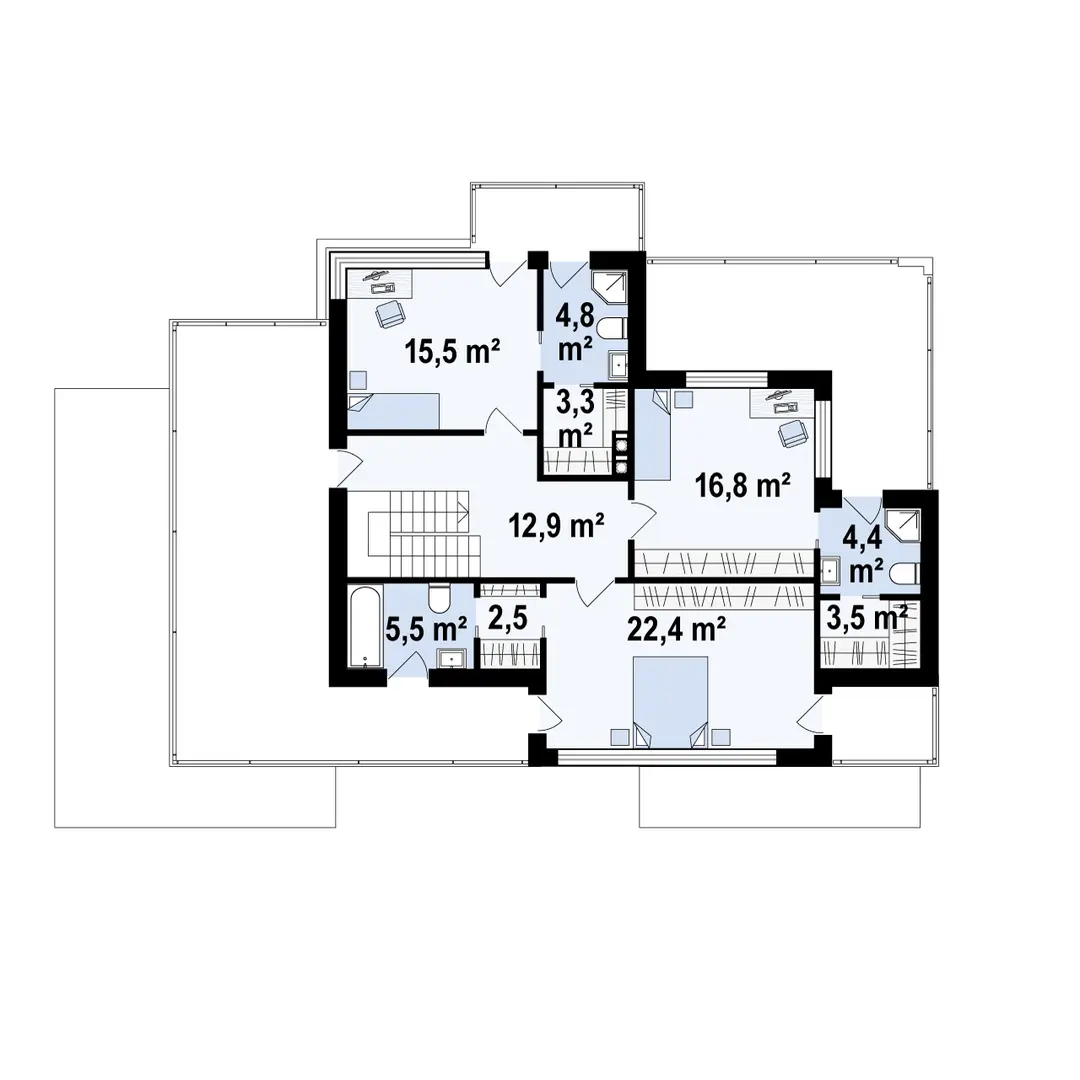 Pokój – 15,6 m² Pokój – 16,8 m² Pokój – 22,5 m² Łazienka – 5,5 m² Łazienka – 4,4 m² Łazienka – 4,9 m² Garderoba – 3,4 m² Garderoba – 3,5 m² Garderoba – 2,6 m² Hol + schody – 18,2 m²