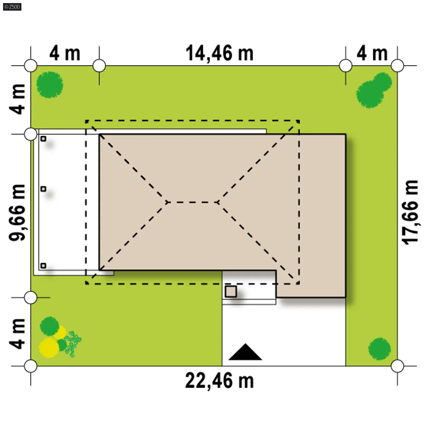 Minimalne wymiary działki szerokość 21,46 m długość 17,66 m Wymiary elewacji frontowej 14,46 m