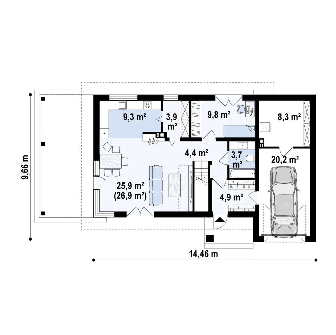 Sień – 4,9 m² Hol – 4,4 m² Salon + jadalnia – 25,9 m² / 26,9 m² Kuchnia – 9,3 m² Spiżarnia – 3,9 m² Gabinet – 9,8 m² Łazienka – 3,7 m² Pomieszczenie gospodarcze – 8,3 m² Garaż – 20,2 m²