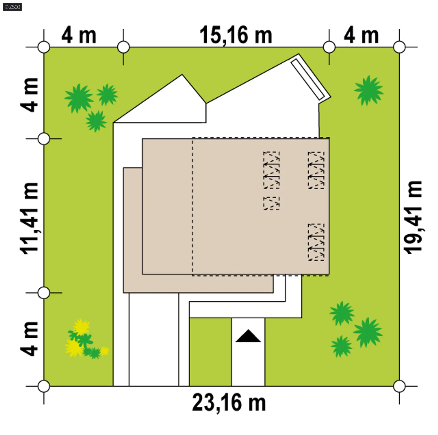 Minimalne wymiary działki szerokość 23,16 m długość 19,41 m Wymiary elewacji frontowej 15,16 m