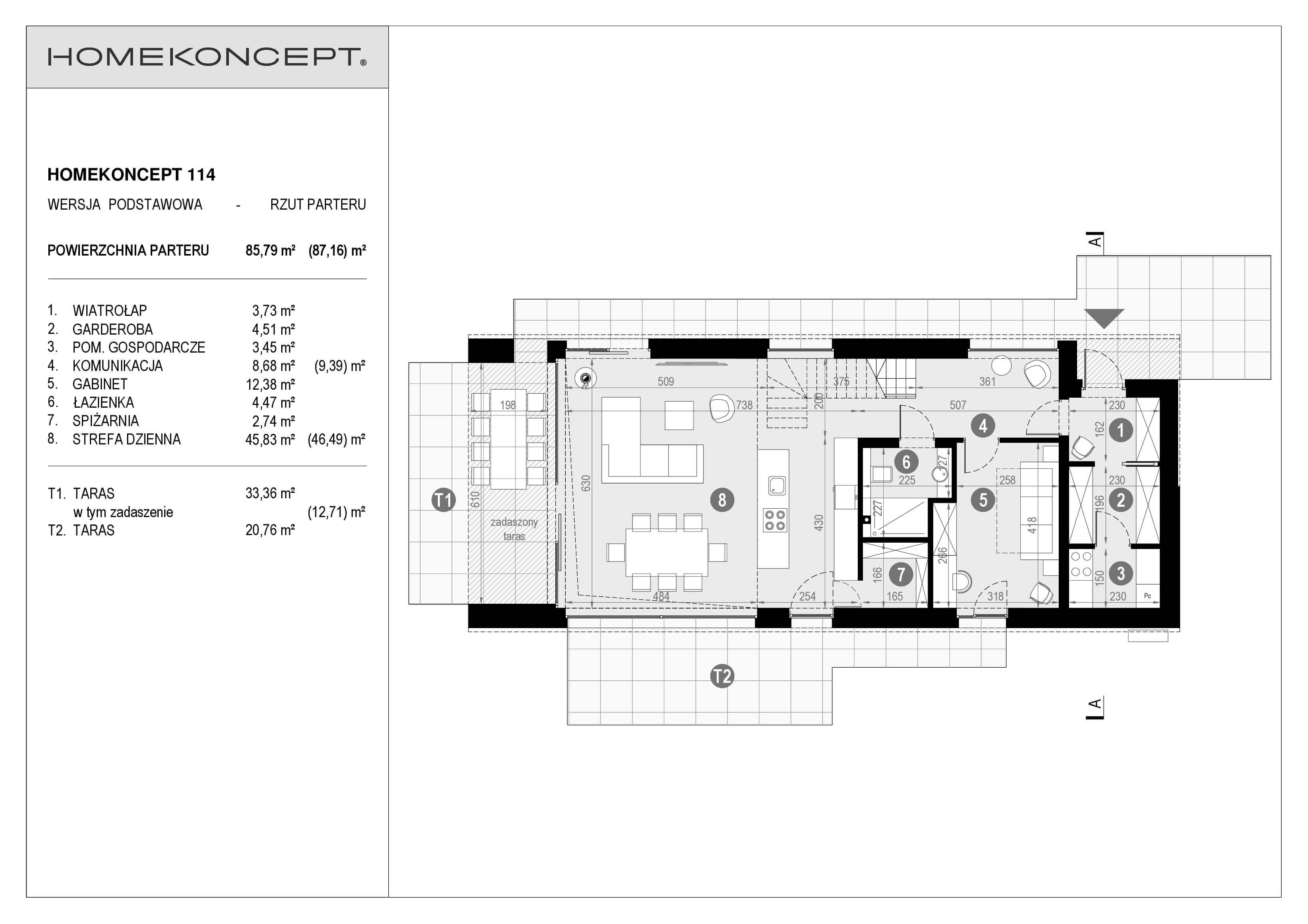 RZUT PARTERU POWIERZCHNIA: 85,79 m² (87,16 m²) 1. WIATROŁAP – 3,73 m² 2. GARDEROBA – 4,51 m² 3. POM. GOSPODARCZE – 3,45 m² 4. KOMUNIKACJA – 8,68 m² (9,39 m²) 5. GABINET – 12,38 m² 6. ŁAZIENKA – 4,47 m² 7. SPIŻARNIA – 2,74 m² 8. STREFA DZIENNA – 45,83 m² (46,49 m²) T1. TARAS – 33,36 m² (12,71 m²) T2. TARAS – 20,76 m²