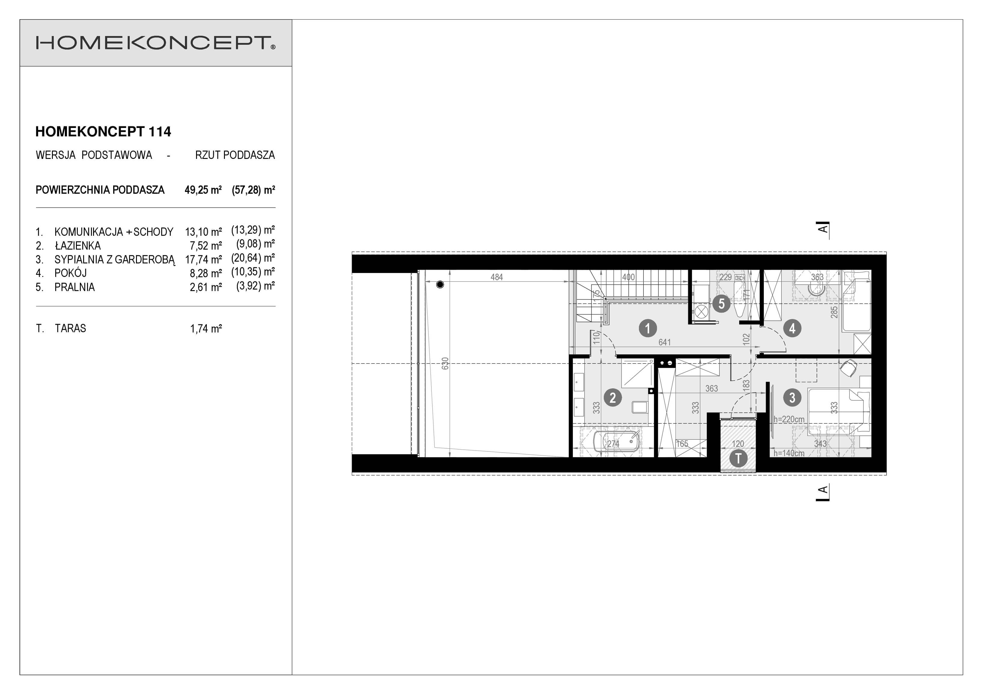 RZUT PODDASZA POWIERZCHNIA: 49,25 m² (57,28 m²) 1. KOMUNIKACJA + SCHODY – 13,10 m² (13,29 m²) 2. ŁAZIENKA – 7,52 m² (9,08 m²) 3. SYPIALNIA Z GARDEROBĄ – 17,74 m² (20,64 m²) 4. POKÓJ – 8,28 m² (10,35 m²) 5. PRALNIA – 2,61 m² (3,92 m²) T. TARAS – 1,74 m²
