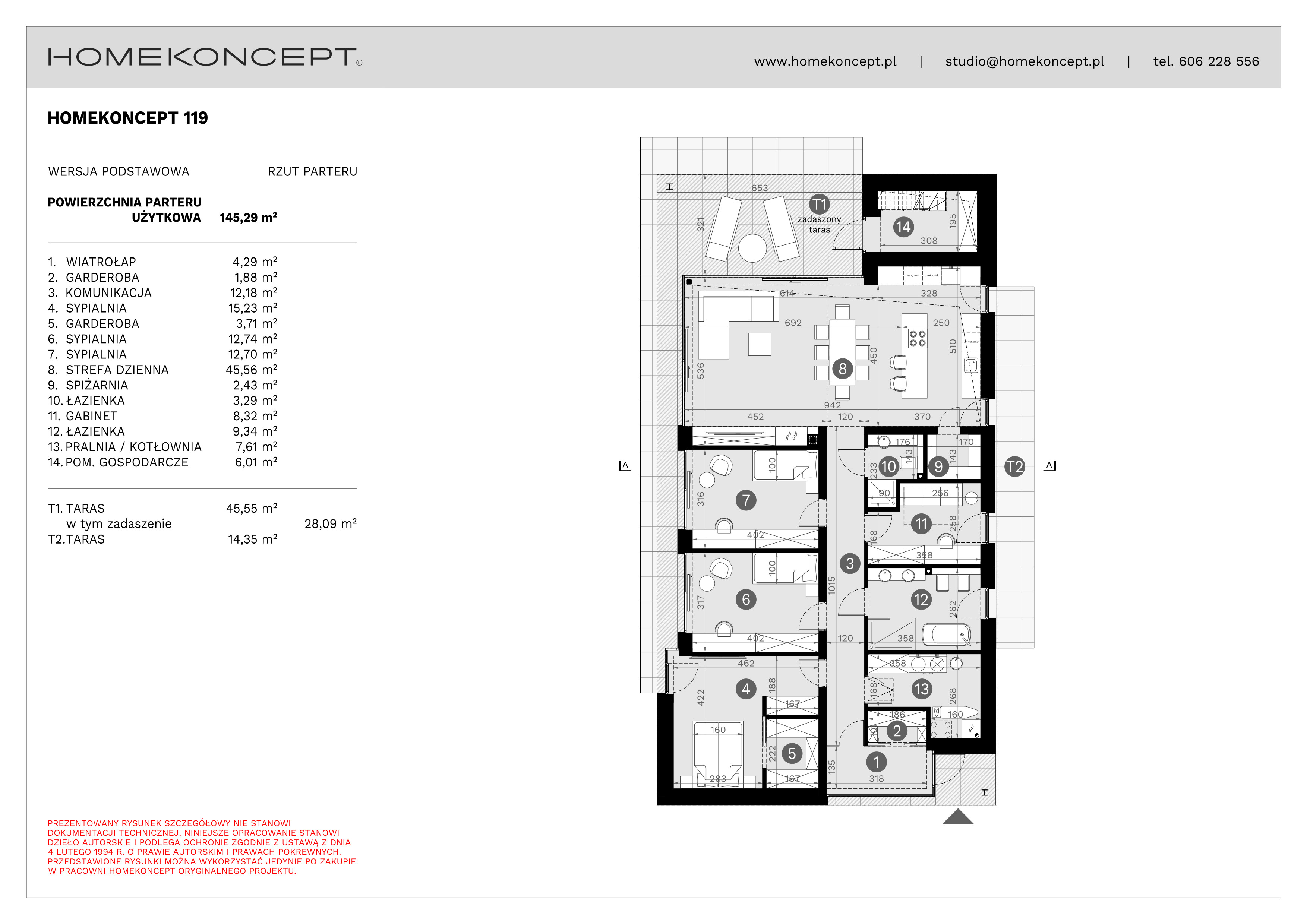 RZUT PARTERU POWIERZCHNIA: 145,29 m² 1. WIATROŁAP – 4,29 m² 2. GARDEROBA – 1,88 m² 3. KOMUNIKACJA – 12,18 m² 4. SYPIALNIA – 15,23 m² 5. GARDEROBA – 3,71 m² 6. SYPIALNIA – 12,74 m² 7. SYPIALNIA – 12,70 m² 8. STREFA DZIENNA – 45,56 m² 9. SPIŻARNIA – 2,43 m² 10. ŁAZIENKA – 3,29 m² 11. GABINET – 8,32 m² 12. ŁAZIENKA – 9,34 m² 13. PRALNIA/KOTŁOWNIA – 7,61 m² 14. POM. GOSPODARCZE – 6,01 m² T1. TARAS – 45,55 m² (28,09 m²) T2. TARAS – 14,35 m²