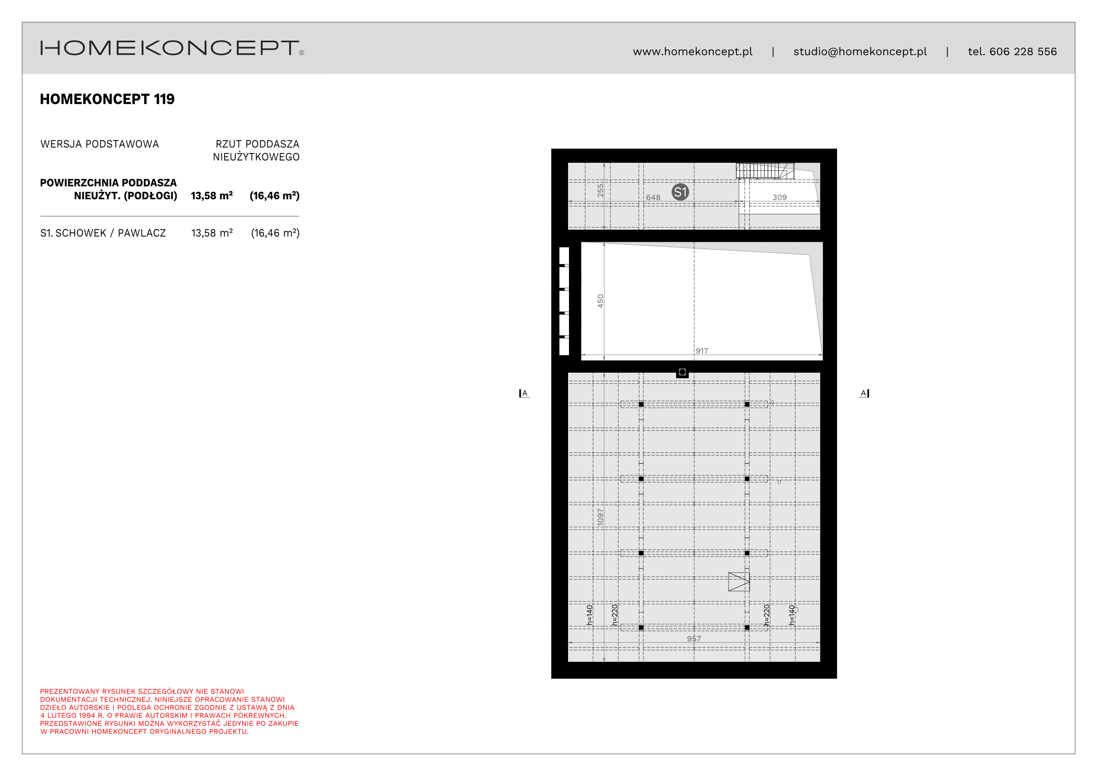 RZUT PODDASZA NIEUŻYTKOWEGO POWIERZCHNIA: 13,58 m² (16,46 m²) 1. SCHOWEK/PAWLACZ – 13,58 m² (16,46 m²)