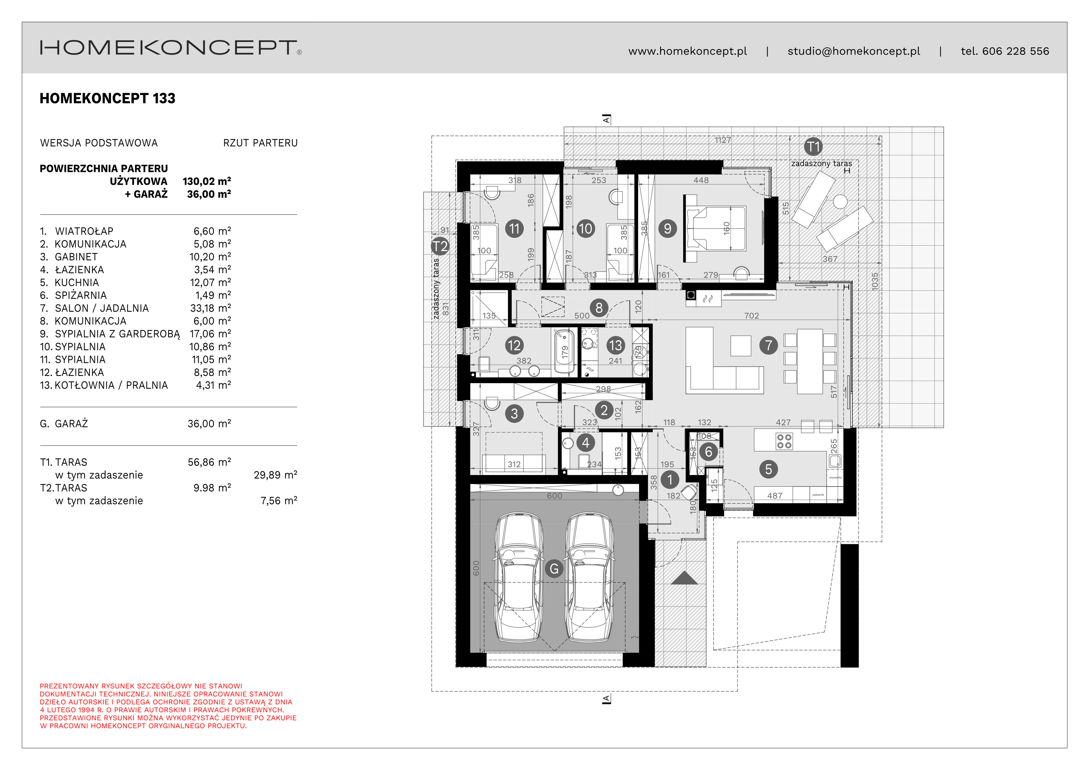 RZUT PARTERU POWIERZCHNIA: 130,02 m² 1. WIATROŁAP – 6,60 m² 2. KOMUNIKACJA – 5,08 m² 3. GABINET – 10,20 m² 4. ŁAZIENKA – 3,54 m² 5. KUCHNIA – 12,07 m² 6. SPIŻARNIA – 1,49 m² 7. SALON/JADALNIA – 33,18 m² 8. KOMUNIKACJA – 6,00 m² 9. SYPIALNIA Z GARDEROBĄ – 17,06 m² 10. SYPIALNIA – 10,86 m² 11. SYPIALNIA – 11,05 m² 12. ŁAZIENKA – 8,58 m² 13. KOTŁOWNIA/PRALNIA – 4,31 m² G. GARAŻ – 36,00 m² T1. TARAS – 56,96 m² (29,77 m²) T2. TARAS – 9,98 m² (7,49 m²)