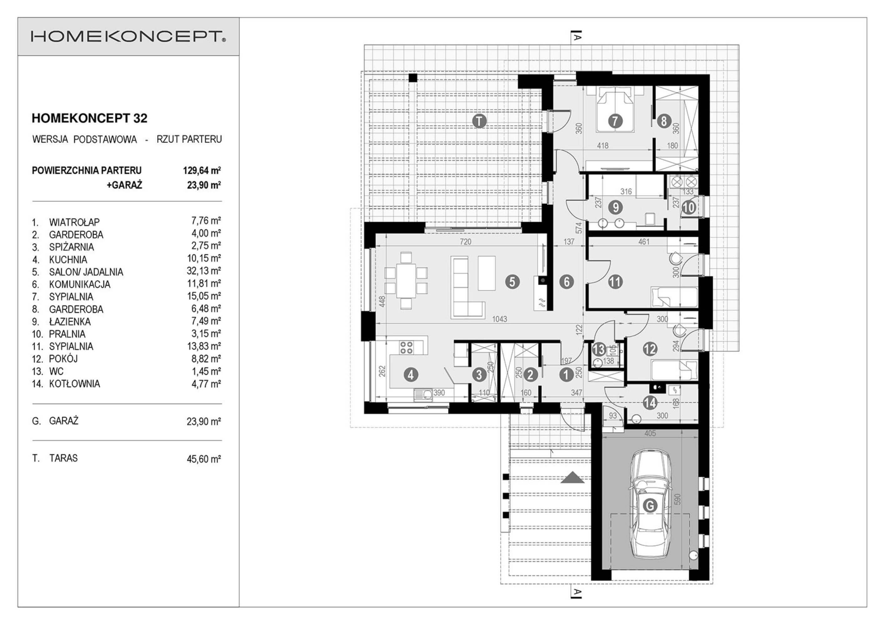 RZUT PARTERU POWIERZCHNIA: 129,64 m² 1. WIATROŁAP – 7,76 m² 2. GARDEROBA – 4,00 m² 3. SPIŻARNIA – 2,75 m² 4. KUCHNIA – 10,15 m² 5. SALON/JADALNIA – 32,13 m² 6. KOMUNIKACJA – 11,81 m² 7. SYPIALNIA – 15,05 m² 8. GARDEROBA – 6,48 m² 9. ŁAZIENKA – 7,49 m² 10. PRALNIA – 3,15 m² 11. SYPIALNIA – 13,83 m² 12. POKÓJ – 8,82 m² 13. TOALETA – 1,45 m² 14. KOTŁOWNIA – 4,77 m² G. GARAŻ – 23,90 m² T. TARAS – 45,60 m²