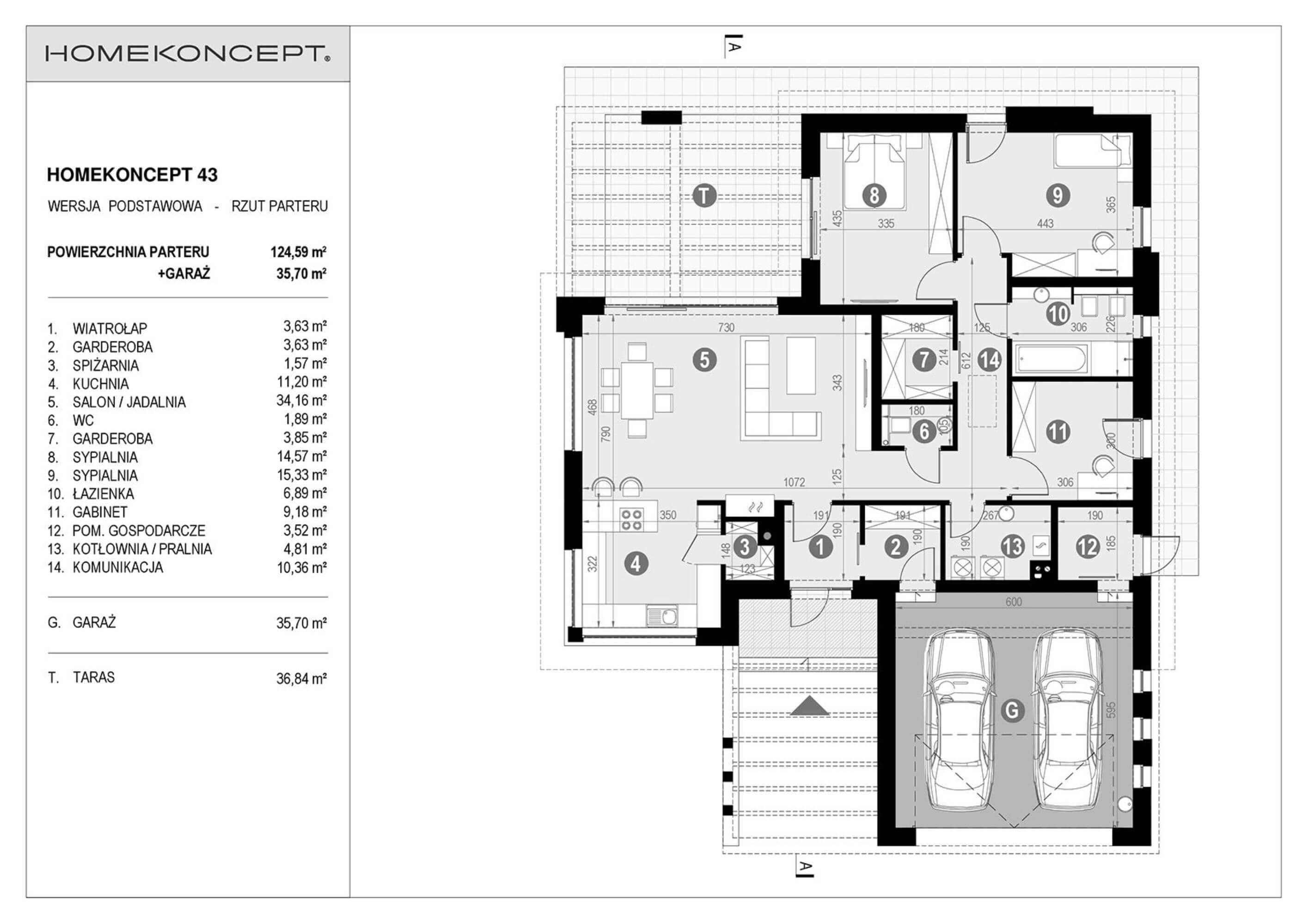 RZUT PARTERU POWIERZCHNIA: 124,59 m² 1. WIATROŁAP – 3,63 m² 2. GARDEROBA – 3,63 m² 3. SPIŻARNIA – 1,57 m² 4. KUCHNIA – 11,20 m² 5. SALON / JADALNIA – 34,16 m² 6. TOALETA – 1,89 m² 7. GARDEROBA – 3,85 m² 8. SYPIALNIA – 14,57 m² 9. SYPIALNIA – 15,33 m² 10. ŁAZIENKA – 6,89 m² 11. GABINET – 9,18 m² 12. POM. GOSPODARCZE – 3,52 m² 13. KOTŁOWNIA / PRALNIA – 4,81 m² 14. KOMUNIKACJA – 10,36 m² G. GARAŻ – 35,70 m² T. TARAS – 36,84 m²