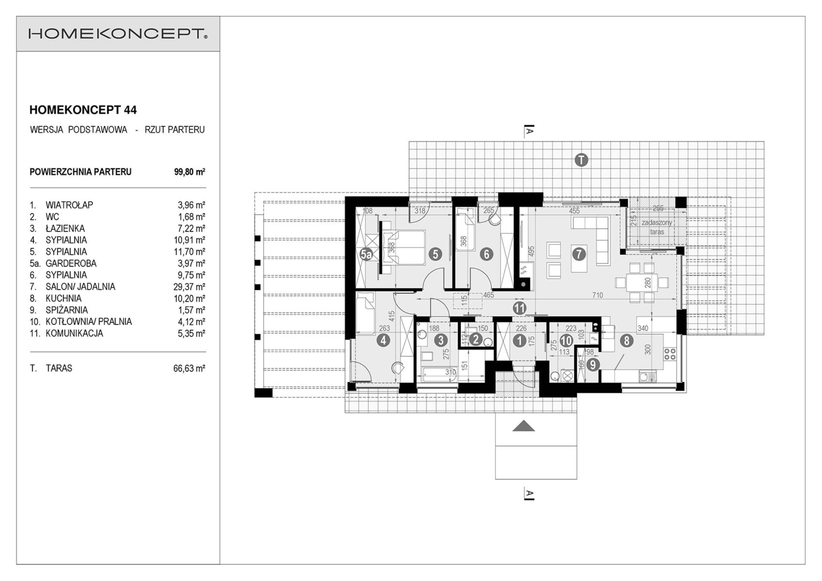 RZUT PARTERU POWIERZCHNIA: 99,80 m² 1. WIATROŁAP – 3,96 m² 2. TOALETA – 1,68 m² 3. ŁAZIENKA – 7,22 m² 4. SYPIALNIA – 10,91 m² 5. SYPIALNIA – 11,70 m² 5A. GARDEROBA – 3,97 m² 6. SYPIALNIA – 9,75 m² 7. SALON/JADALNIA – 29,37 m² 8. KUCHNIA – 10,20 m² 9. SPIŻARNIA – 1,57 m² 10. KOTŁOWNIA/PRALNIA – 4,12 m² 11. KOMUNIKACJA – 5,35 m² T. TARAS – 66,63 m²
