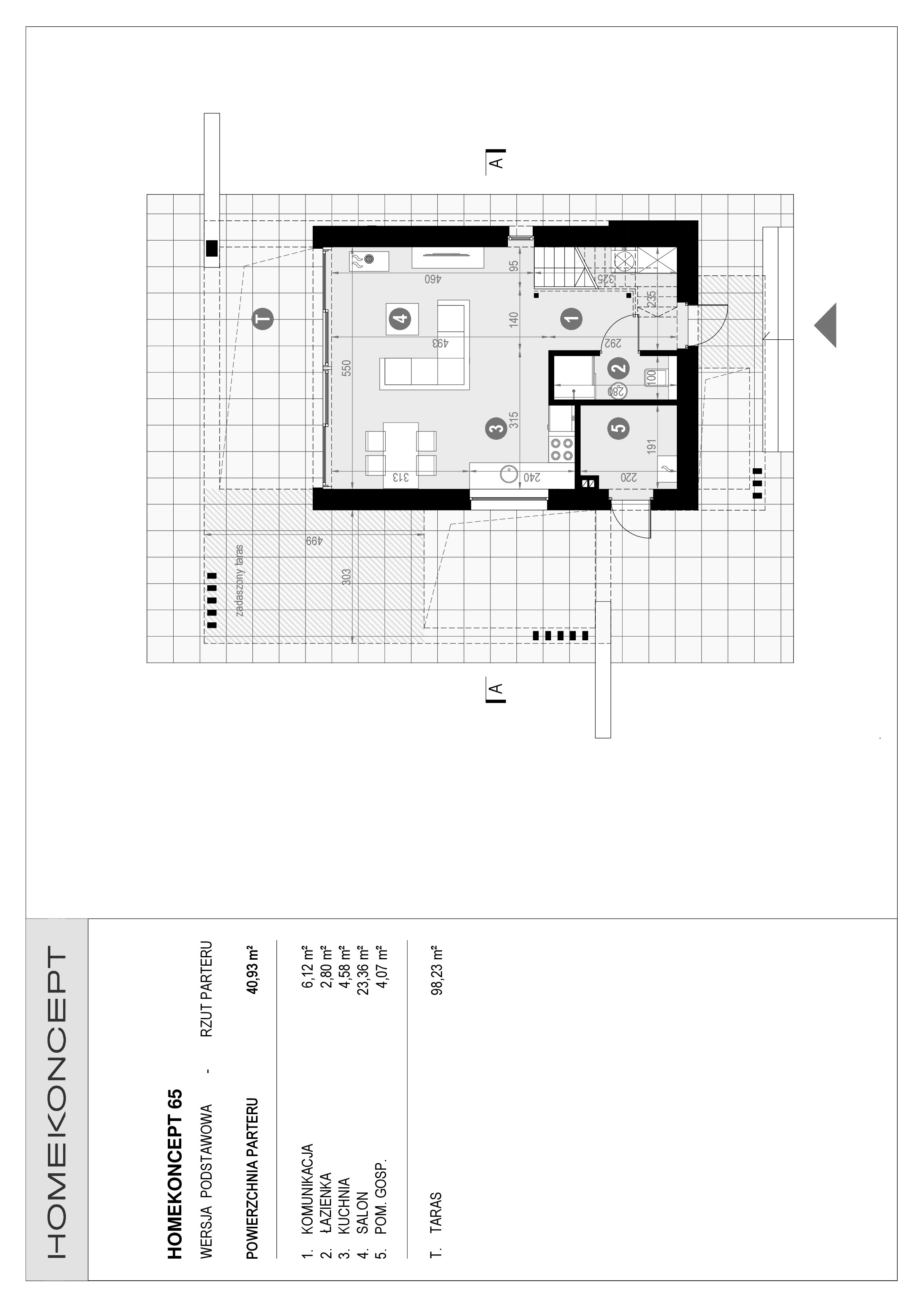RZUT PARTERU POWIERZCHNIA: 40,93 m² 1. KOMUNIKACJA – 6,12 m² 2. ŁAZIENKA – 2,80 m² 3. KUCHNIA – 4,58 m² 4. SALON – 23,36 m² 5. POM. GOSPODARCZE – 4,07 m² T. TARAS – 98,23 m²