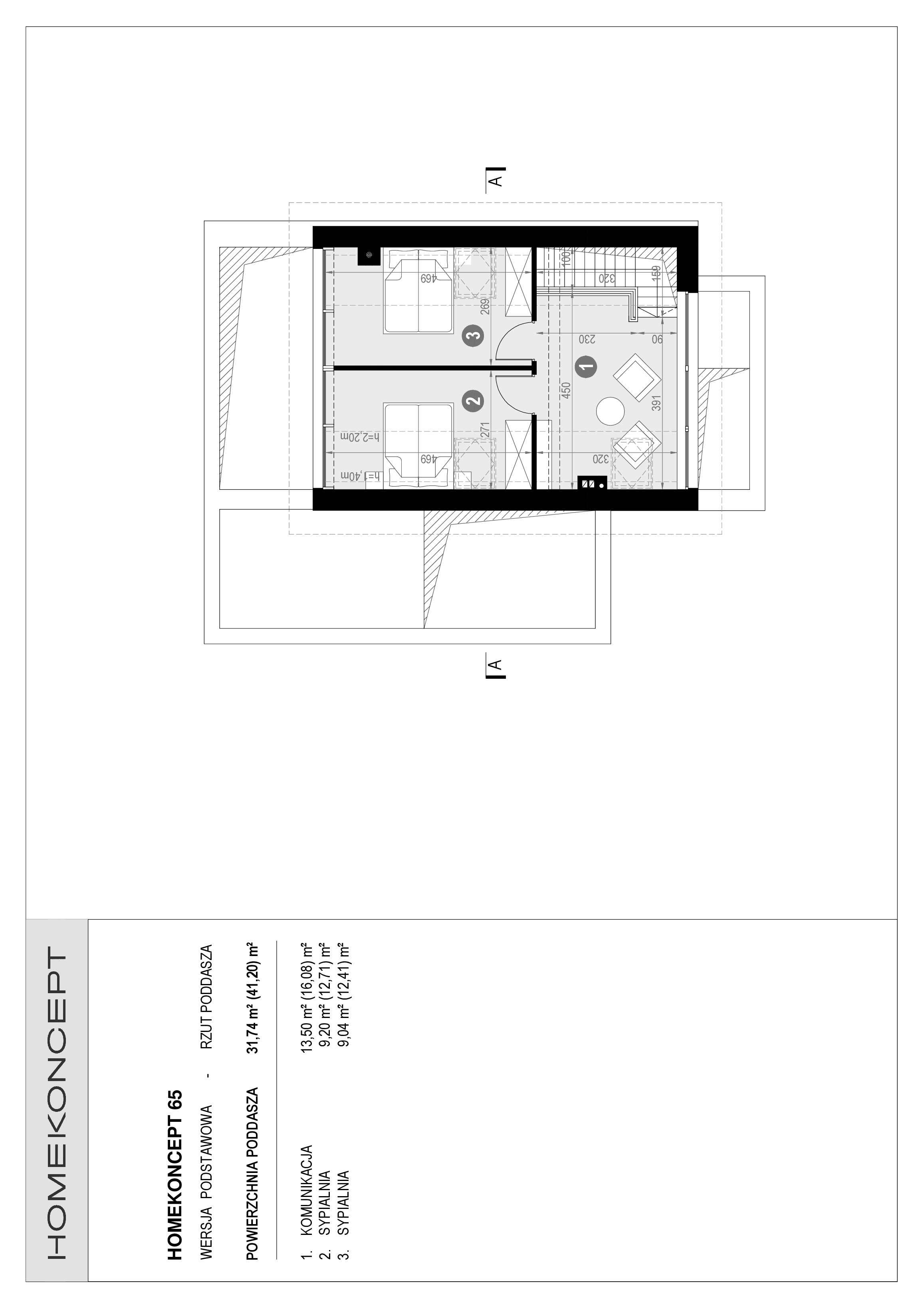 RZUT PODDASZA POWIERZCHNIA: 31,74 m² (41,20 m²) 1. KOMUNIKACJA – 13,50 m² (16,08 m²) 2. SYPIALNIA – 9,20 m² (12,71 m²) 3. SYPIALNIA – 9,04 m² (12,41 m²)