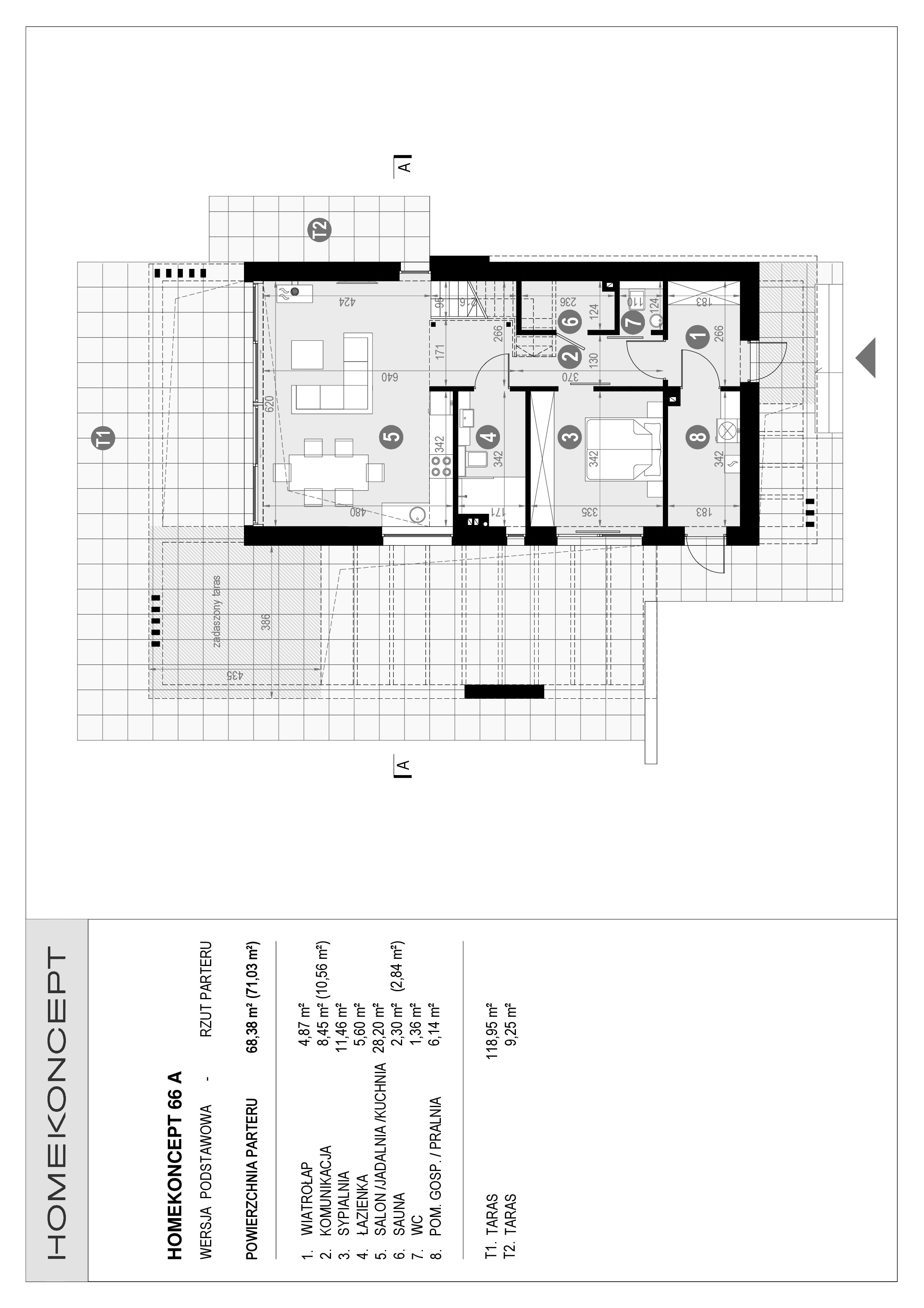 RZUT PARTERU POWIERZCHNIA: 68,38 m² (71,03 m²) 1. WIATROŁAP – 4,87 m² 2. KOMUNIKACJA – 8,45 m² (10,56 m²) 3. SYPIALNIA – 11,46 m² 4. ŁAZIENKA – 5,60 m² 5. SALON JADALNIA/KUCHNIA – 28,20 m² 6. SAUNA – 2,30 m² (2,84 m²) 7. TOALETA – 1,36 m² 8. POM. GOSPODARCZE/PRALNIA – 6,14 m² T1. TARAS – 118,95 m² T2. TARAS – 9,25 m²