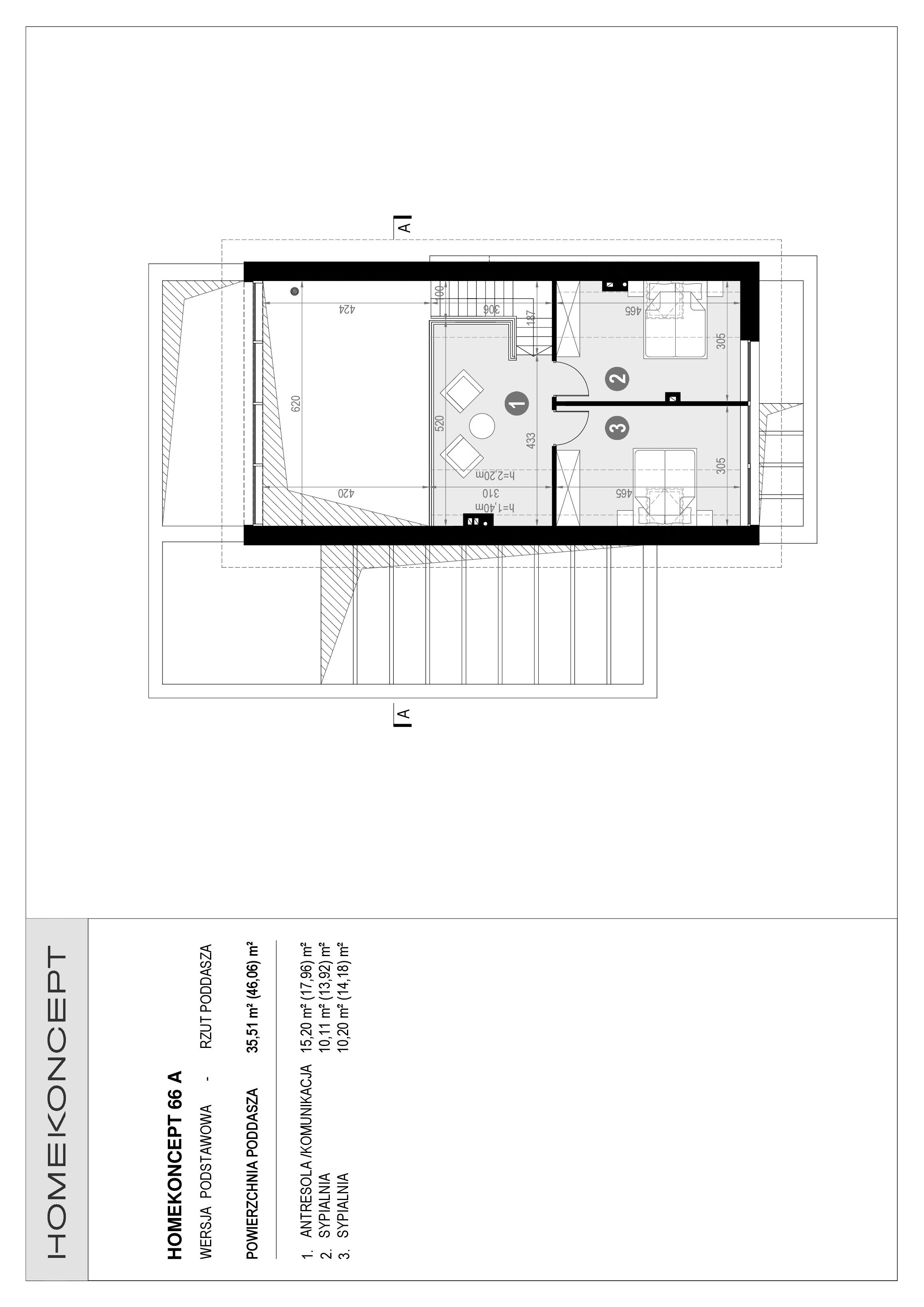 RZUT PODDASZA POWIERZCHNIA: 35,51 m² (46,06 m²) 1. ANTRESOLA/KOMUNIKACJA – 15,20 m² (17,96 m²) 2. SYPIALNIA – 10,11 m² (13,92 m²) 3. SYPIALNIA – 10,20 m² (14,18 m²)