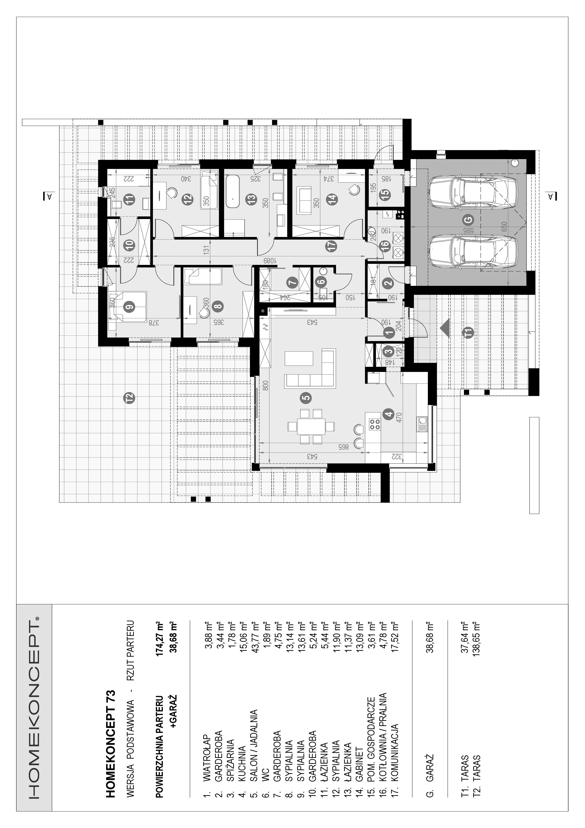 RZUT PARTERU POWIERZCHNIA: 174,27 m² 1. WIATROŁAP – 3,88 m² 2. GARDEROBA – 3,44 m² 3. SPIŻARNIA – 1,78 m² 4. KUCHNIA – 15,06 m² 5. SALON/JADALNIA – 43,77 m² 6. TOALETA – 1,89 m² 7. GARDEROBA – 4,75 m² 8. SYPIALNIA – 13,14 m² 9. SYPIALNIA – 13,61 m² 10. GARDEROBA – 5,24 m² 11. ŁAZIENKA – 5,44 m² 12. SYPIALNIA – 11,90 m² 13. ŁAZIENKA – 11,37 m² 14. GABINET – 13,09 m² 15. POM. GOSPODARCZE – 3,61 m² 16. KOTŁOWNIA/PRALNIA – 4,78 m² 17. KOMUNIKACJA – 17,52 m² G. GARAŻ – 38,68 m² T1. TARAS – 37,64 m² T2. TARAS – 138,65 m²