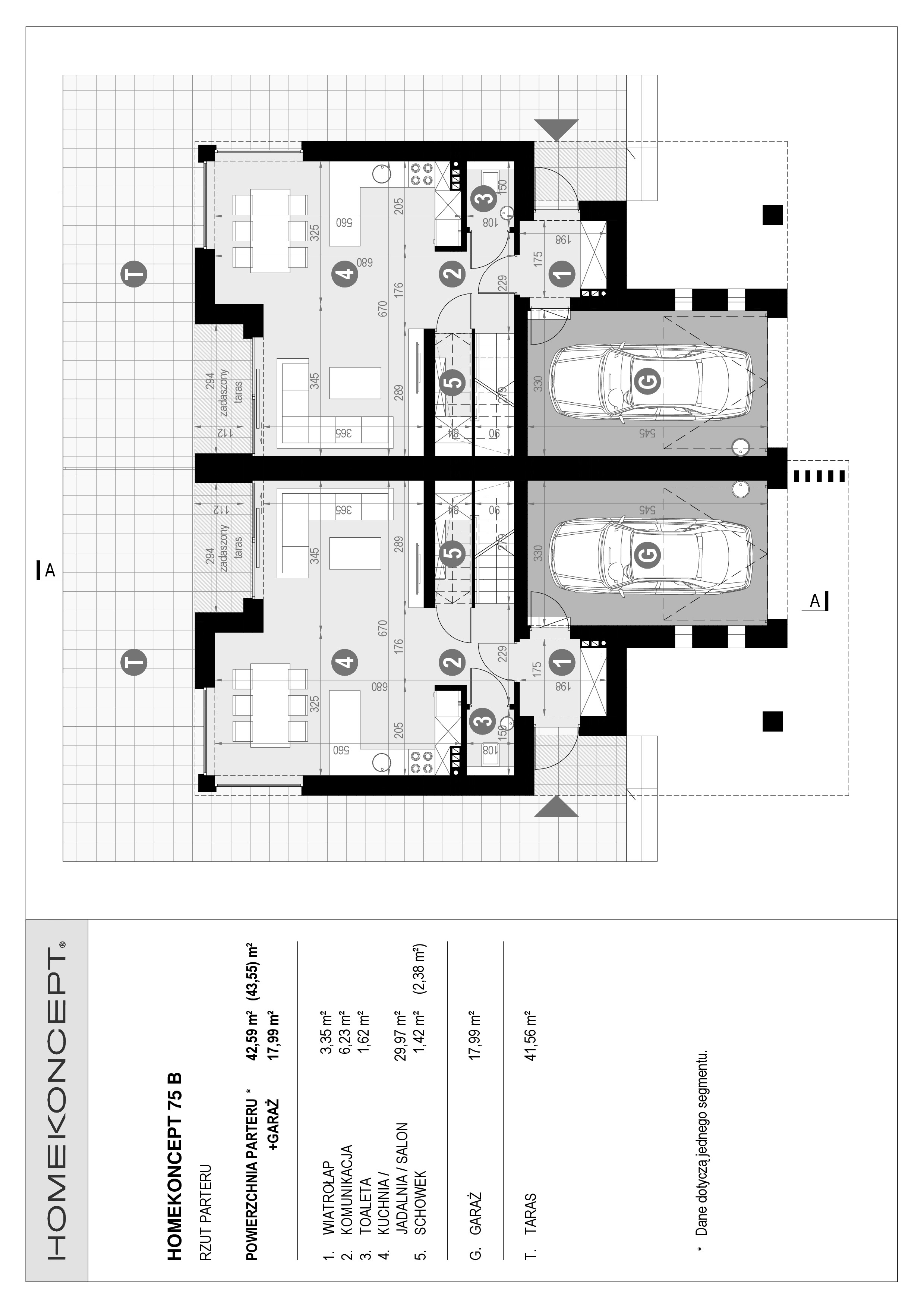 RZUT PARTERU POWIERZCHNIA: 42,59 m² (43,55 m²) 1. WIATROŁAP – 3,35 m² 2. KOMUNIKACJA – 6,23 m² 3. TOALETA – 1,62 m² 4. KUCHNIA/JADALNIA/SALON – 29,97 m² 5. SPIŻARNIA – 1,42 m² (2,38 m²) G. GARAŻ – 17,99 m² T. TARAS – 41,56 m²