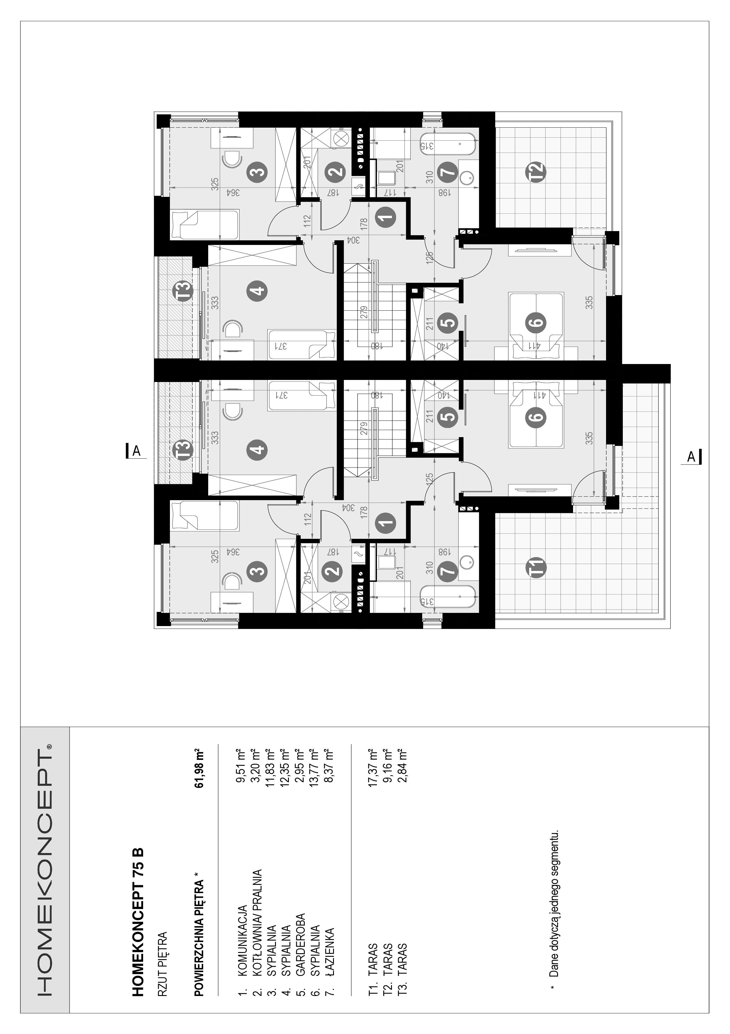 RZUT PIĘTRA POWIERZCHNIA: 61,98 m² 1. KOMUNIKACJA – 9,51 m² 2. KOTŁOWNIA/PRALNIA – 3,20 m² 3. SYPIALNIA – 11,83 m² 4. SYPIALNIA – 12,35 m² 5. GARDEROBA – 2,95 m² 6. SYPIALNIA – 13,77 m² 7. ŁAZIENKA – 8,37 m² T1. TARAS – 17,37 m² T2. TARAS – 9,16 m² T3. TARAS – 2,84 m²