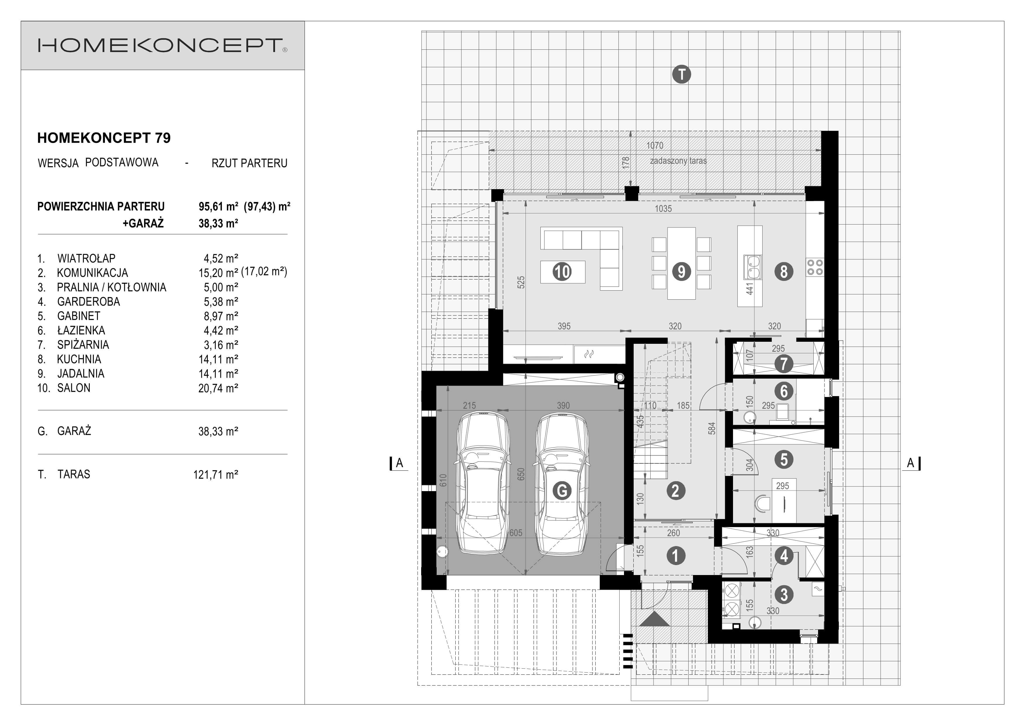 RZUT PARTERU POWIERZCHNIA: 95,61 m² (97,43 m²) 1. WIATROŁAP – 4,52 m² 2. KOMUNIKACJA – 15,20 m² (17,02 m²) 3. PRALNIA/KOTŁOWNIA – 5,00 m² 4. GARDEROBA – 5,38 m² 5. GABINET – 8,97 m² 6. ŁAZIENKA – 4,42 m² 7. SPIŻARNIA – 3,16 m² 8. KUCHNIA – 14,11 m² 9. JADALNIA – 14,11 m² 10. SALON – 20,74 m² G. GARAŻ – 38,33 m² T. TARAS – 121,71 m²